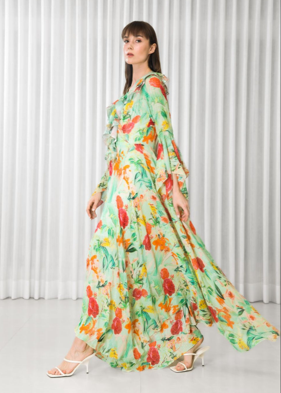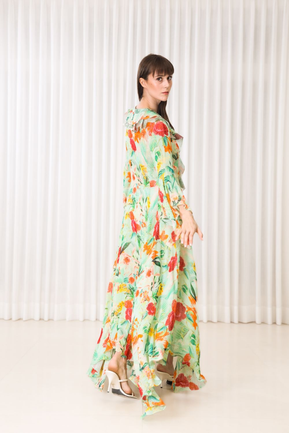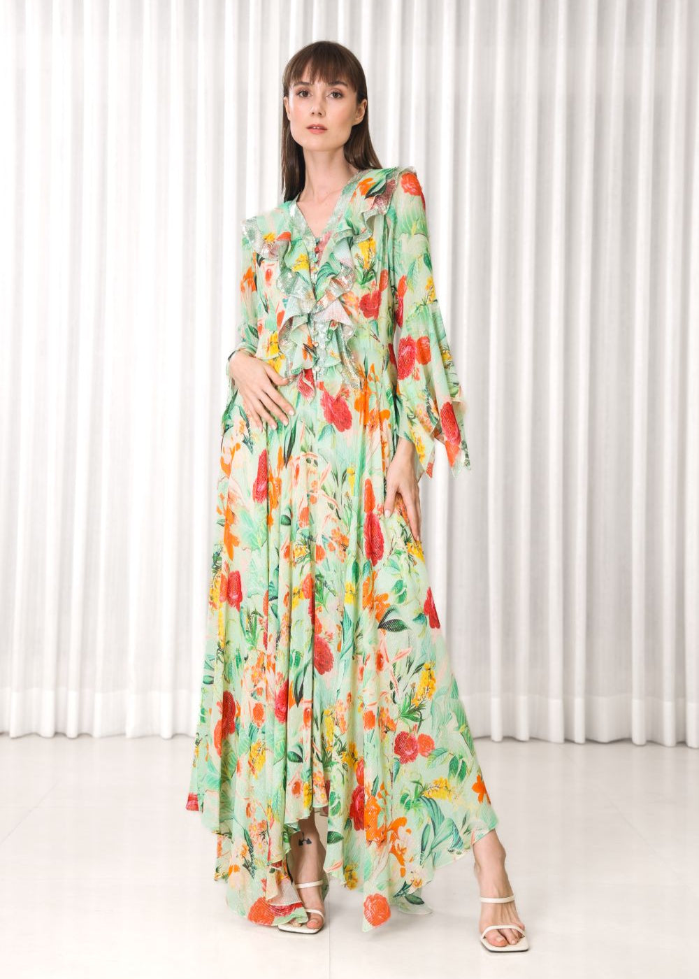 Dahlia Bouquet Printed High Low Lurex Georgette Dress With Sequins Ruffled Detail