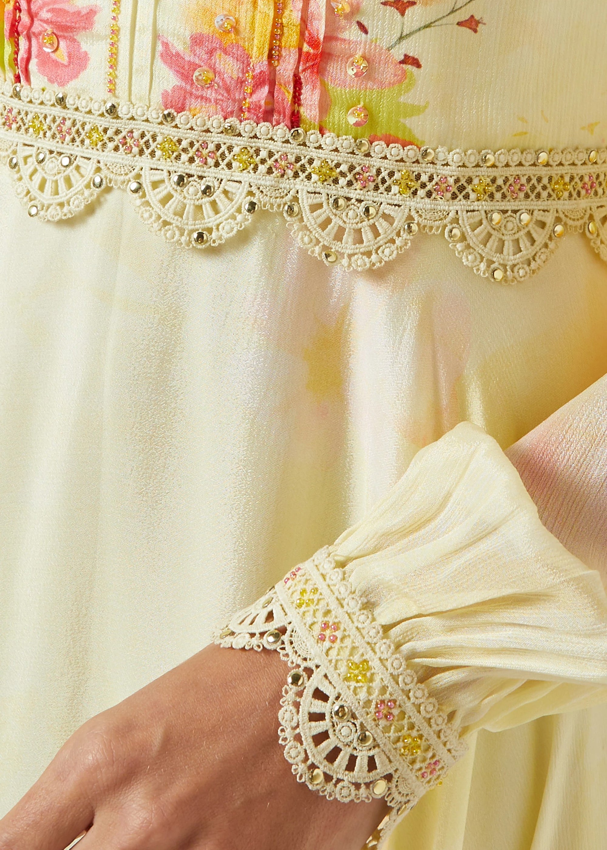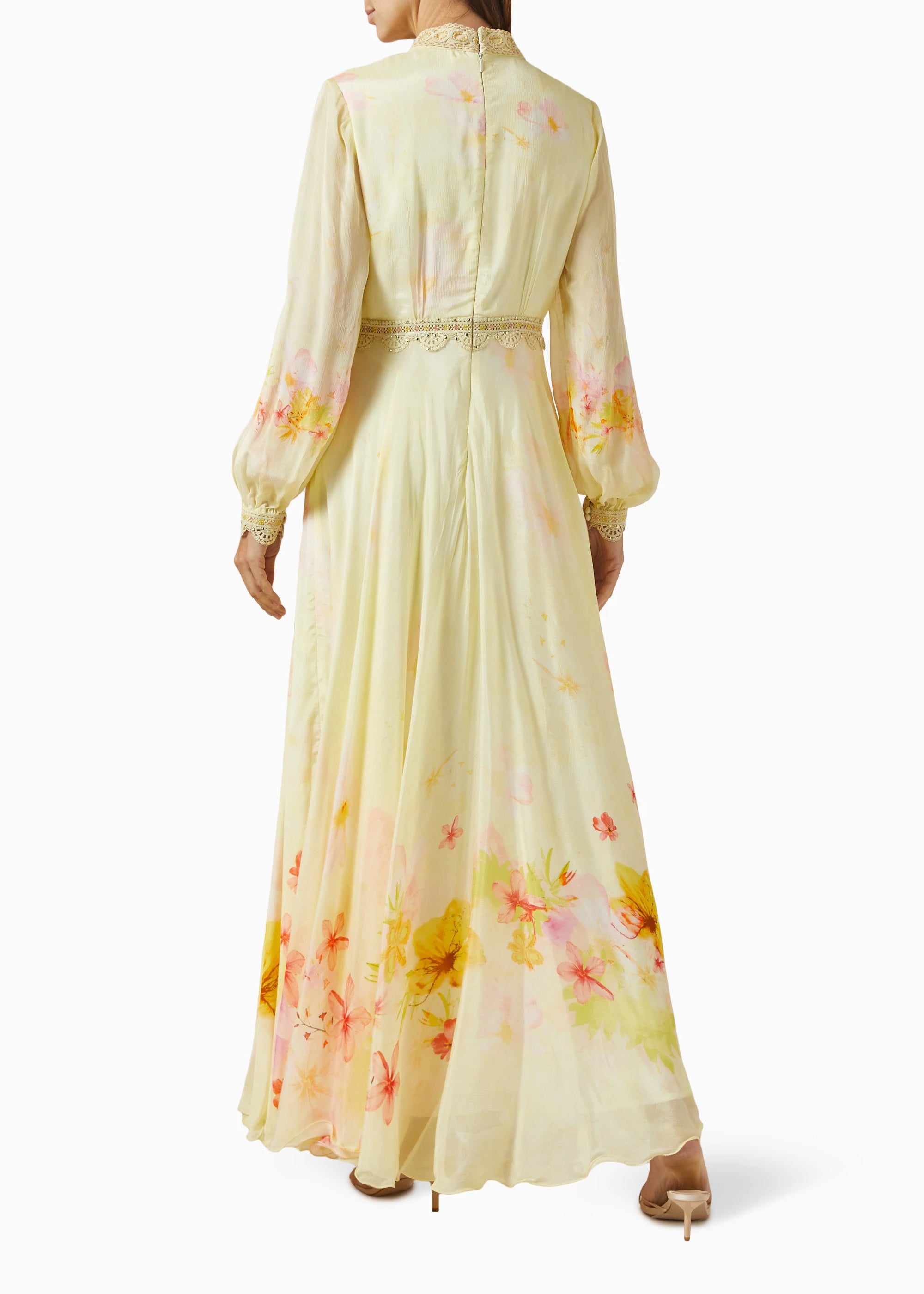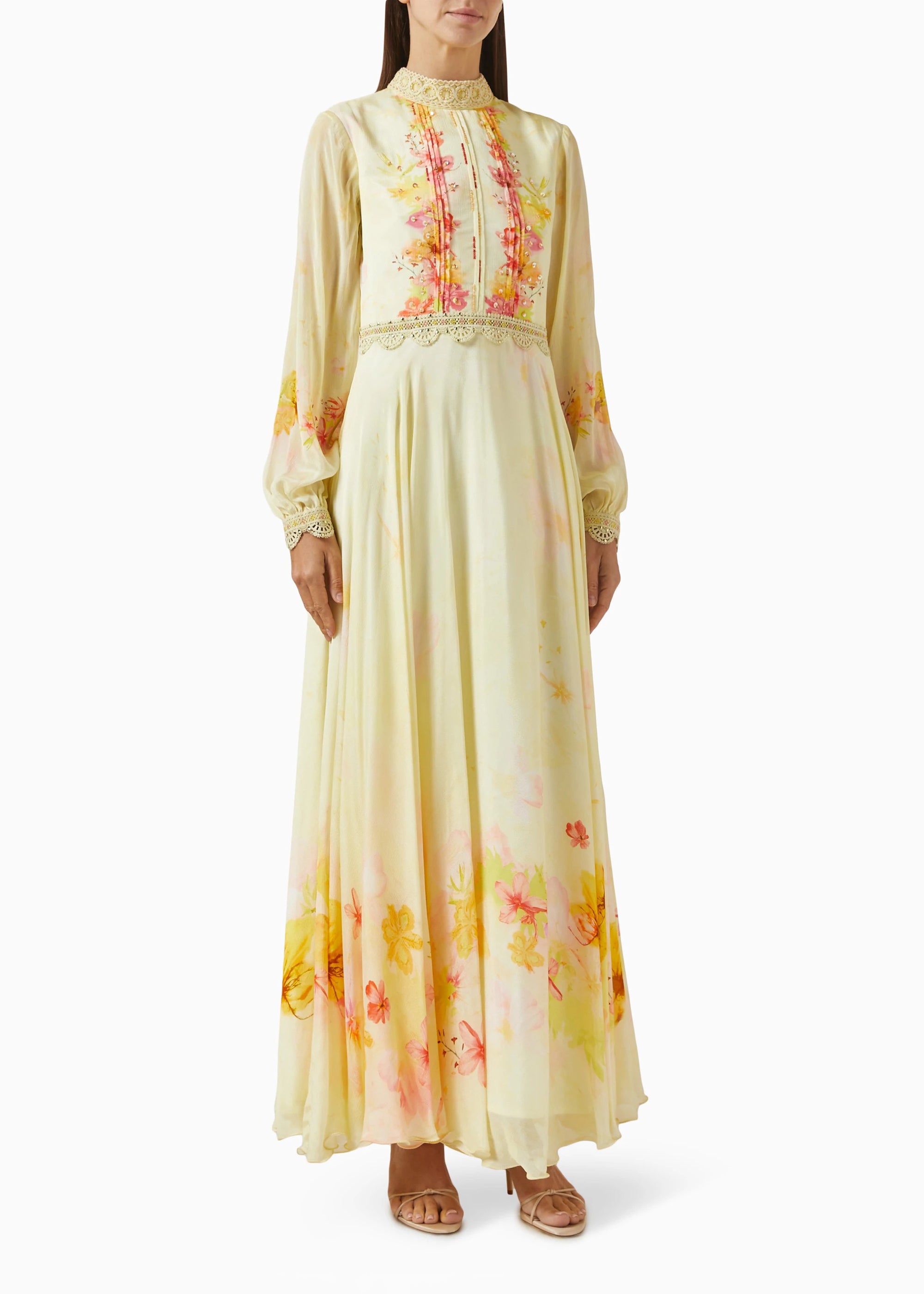 A flowing silhouette, this embellished chiffon maxi dress offers graceful structure and movement. It ensures lightweight comfort and effortless elegance, blending celebratory function with refined style perfectly. The intricate embellishments on the bodice provide a sparkling, polished detail, enhancing its sophisticated appeal.