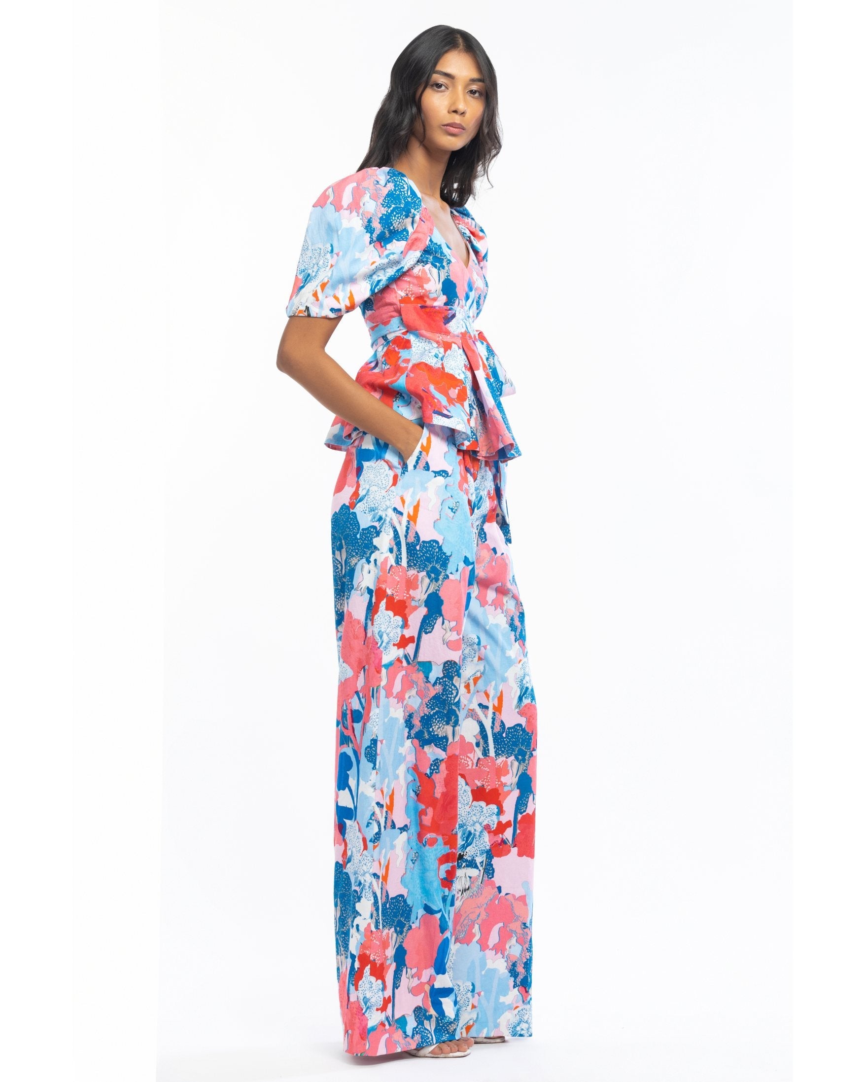 The delightful blue and pink tropical print on premium cotton poplin fabric exudes a playful yet sophisticated charm, making it an irresistible addition to your wardrobe. The wrap peplum top with puff-draped sleeves adds a touch of femininity and allure, while the printed pleated pants elevate the ensemble with a chic and stylish flair.