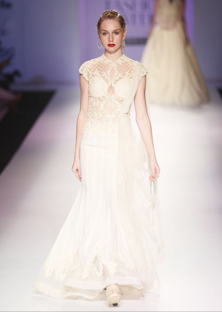 The sheer panels and flowing silhouette create a dreamy, modern bridal-chic look—sophisticated yet weightless for any elegant evening or couture occasion.