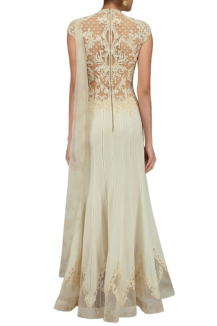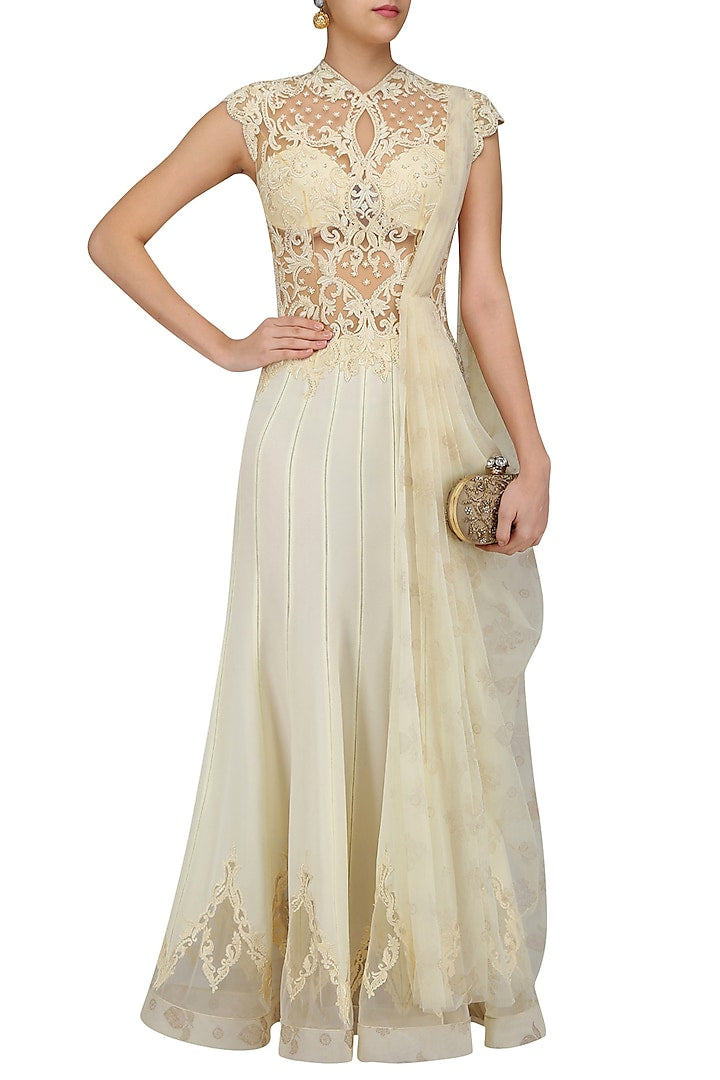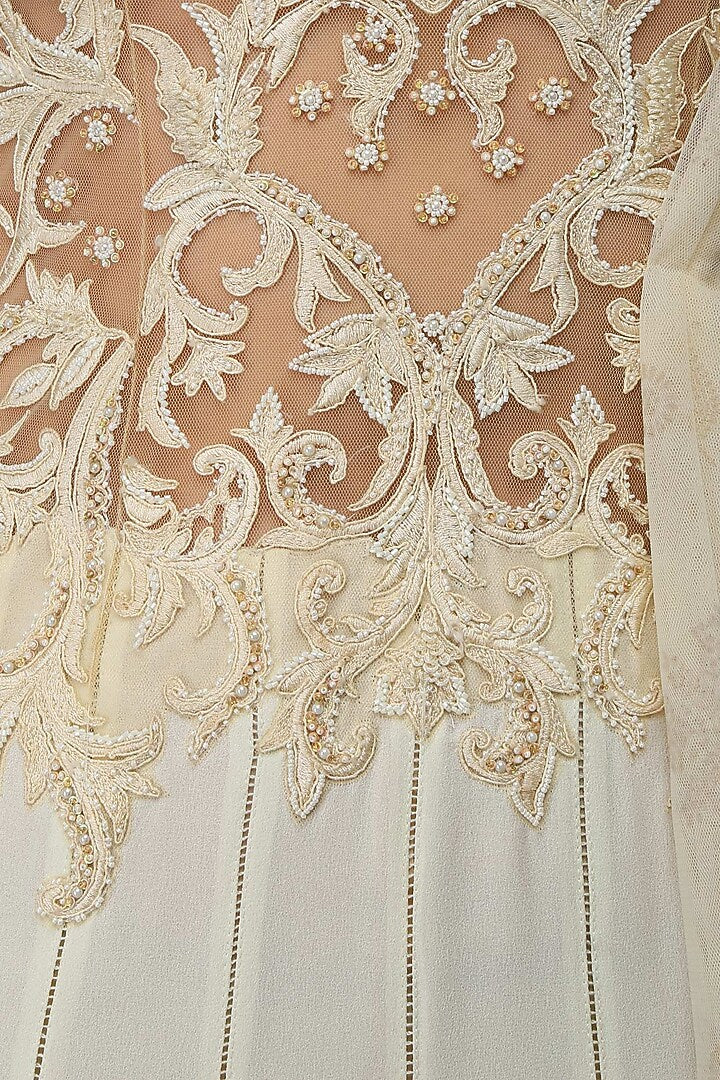 An ethereal floor-grazing gown in airy chiffon and delicate net, featuring intricate lace-like embroidery that skims the bodice and hem.