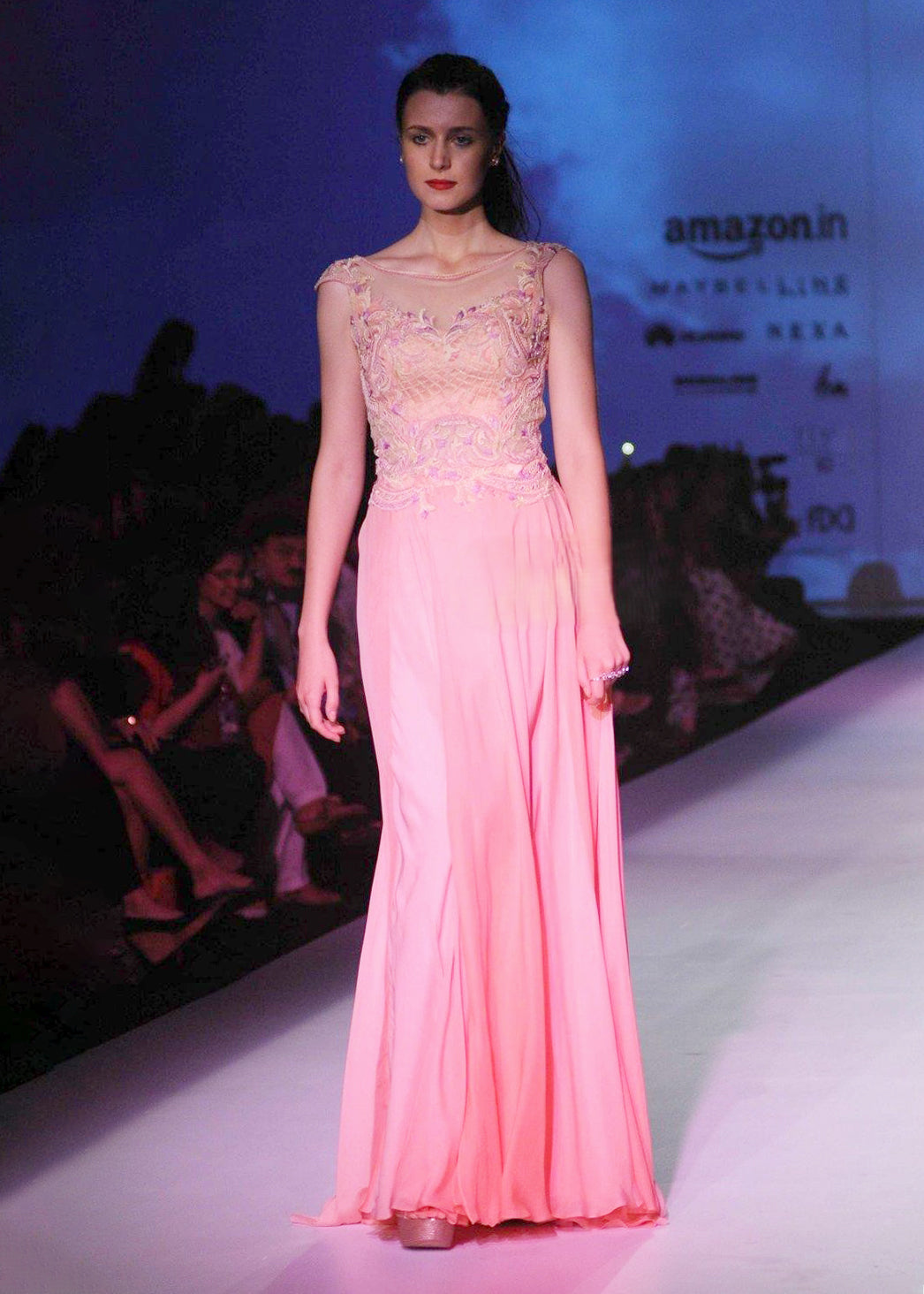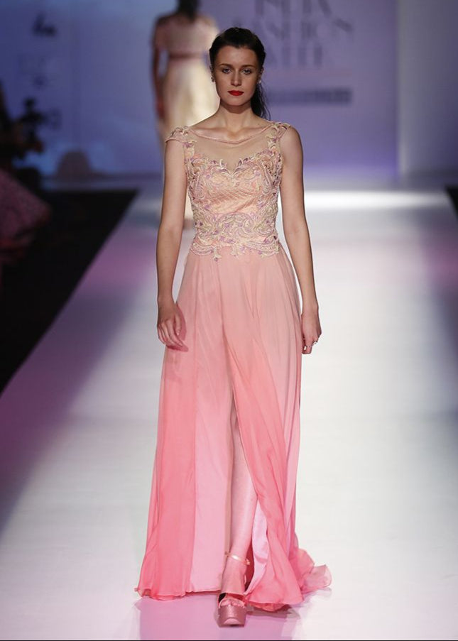 The illusion neckline adds a touch of modern elegance, while the intricate floral handwork creates a soft romantic texture against the skin. Flowing into a floor-length silhouette, the gown drapes gracefully with lightweight layers that enhance fluid movement and sophistication. Designed to flatter, the ensemble strikes a perfect balance between timeless grace and contemporary allure, making it an ideal choice for soirées, gala evenings, or destination weddings.
