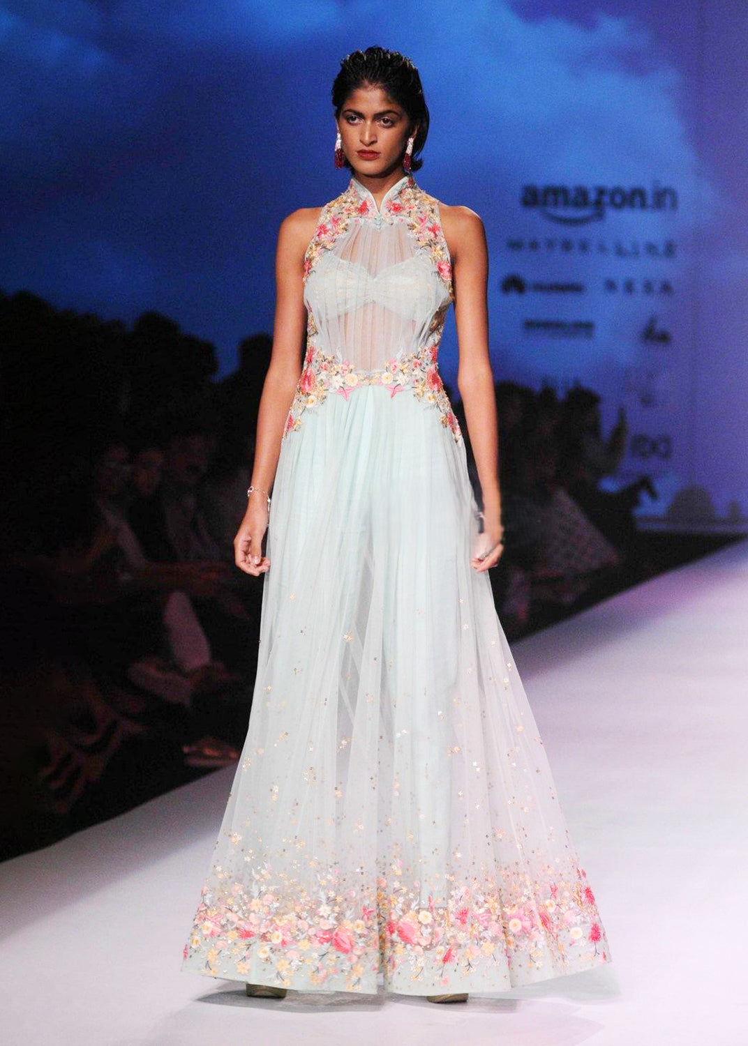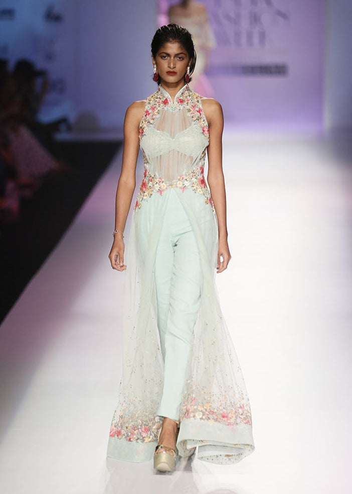 Crafted in a soft aqua blue hue, this three-piece set features a sheer longline embroidered jacket delicately adorned with floral threadwork and sequin embellishments along the hemline and shoulders, paired with sleek straight-cut trousers in matching aqua and a lace-detailed bustier. The intricate floral embroidery in pastel pinks, corals, and ivory breathes freshness into the outfit, making it perfect for contemporary soirées or festive celebrations.