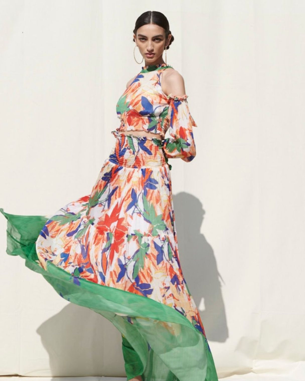 Chiffon Skirts With Smocking On Its Waist Paired With A Halter Crop Top With Placement Prints On It
