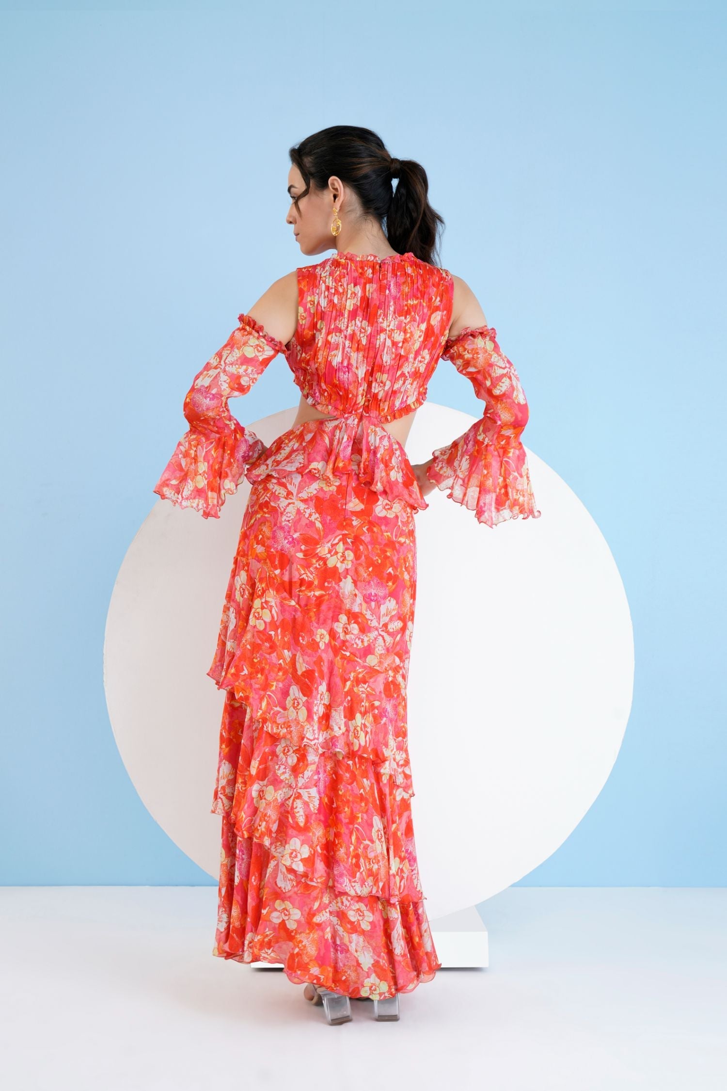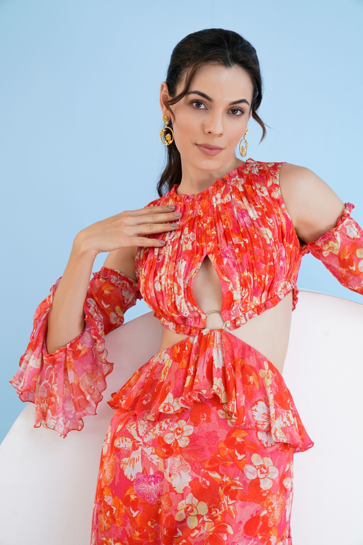 Featuring dark orchid printed tiered dress in chiffon with side slit and waist cutout.