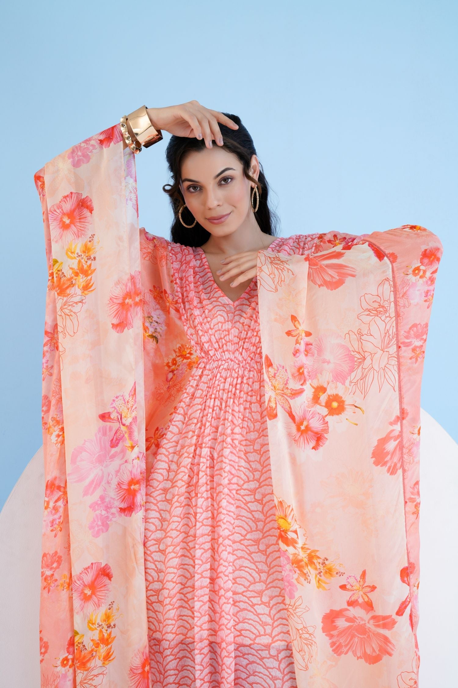 Featuring a mushroom and pastoral printed paneled kaftan in chiffon with gather detail.