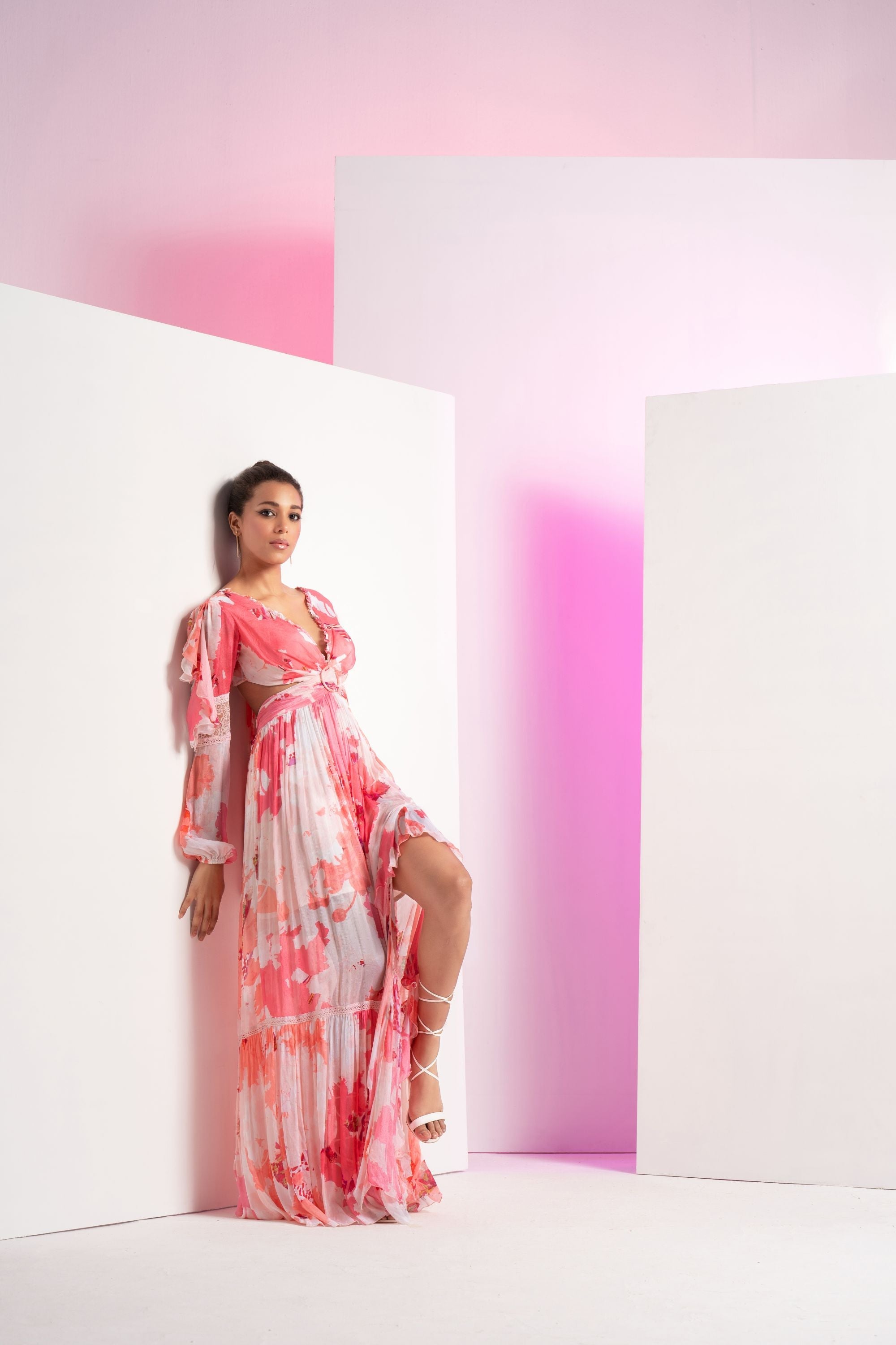 This maxi dress showcases a delightful floral pattern reminiscent of blooming buds in full splendor, creating a captivating and fresh look that's perfect for various occasions.