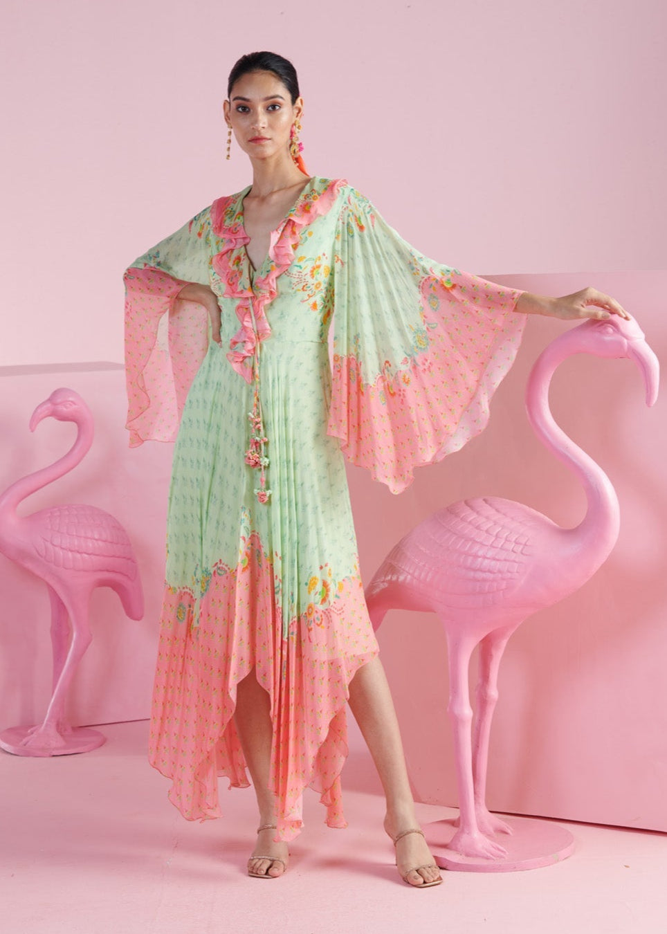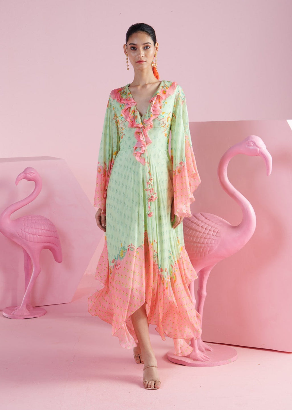 Step into fresh elegance with our Mint Blossom Asymmetrical Dress, featuring a light green hue accented with a delicate pink border. The dress showcases a flattering V-neckline adorned with soft ruffles, adding a touch of romantic charm. The asymmetrical hemline gives the dress a modern edge, while the ruffled neck detail brings a playful, feminine touch. Perfect for daytime events or a graceful evening out, this dress combines classic style with contemporary flair, making it a versatile addition to your wardrobe.