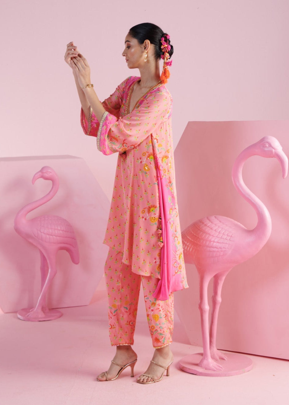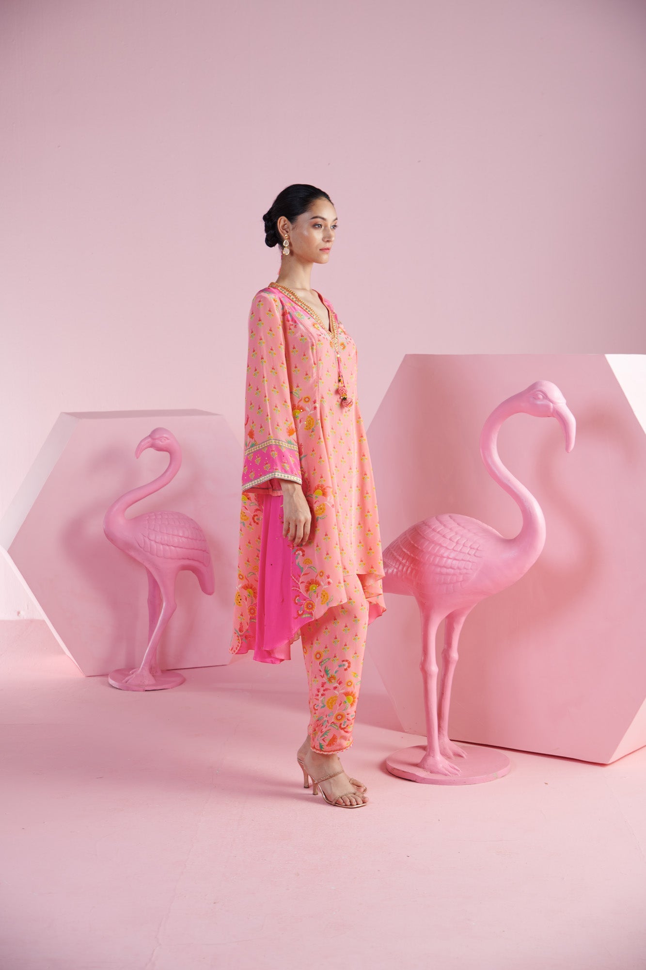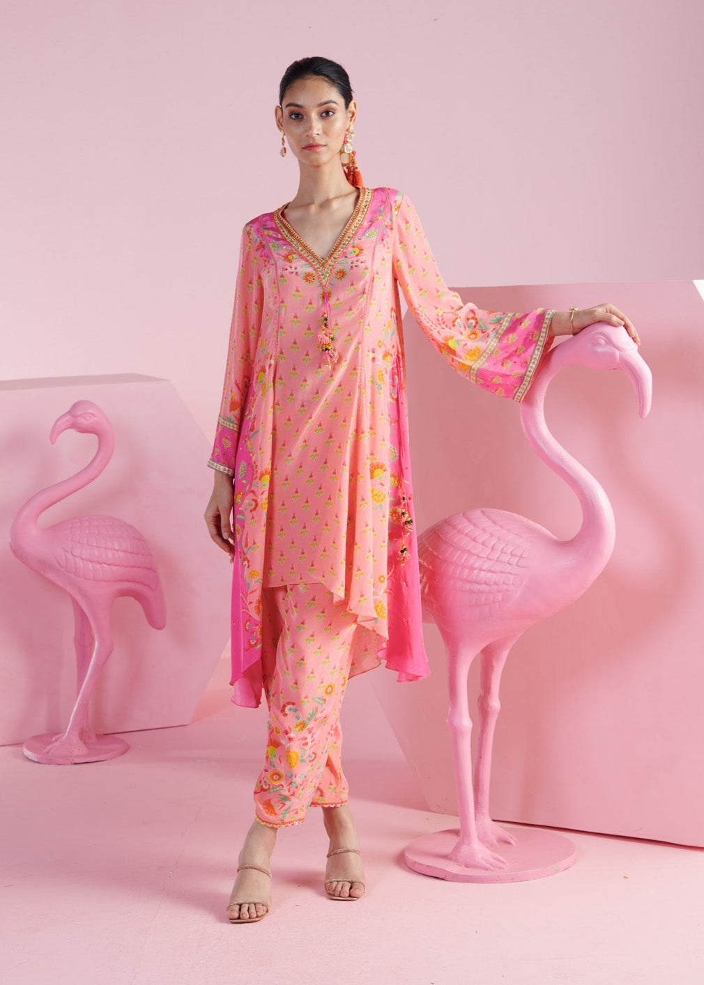 Experience effortless elegance with our blush harmony asymmetrical kurta set. This stunning ensemble features a beautifully printed pink kurta with a unique asymmetrical hemline that adds a modern twist to a traditional silhouette. The v neck has intricate embroidery detail. The kurta’s loose fit ensures comfort and ease, making it perfect for any occasion. Paired with matching loose-fit pants, this set offers a cohesive and relaxed look that exudes grace and style. Whether you’re attending a casual gathering or a festive event, this kurta set is your go-to for a chic and comfortable outfit that stands out