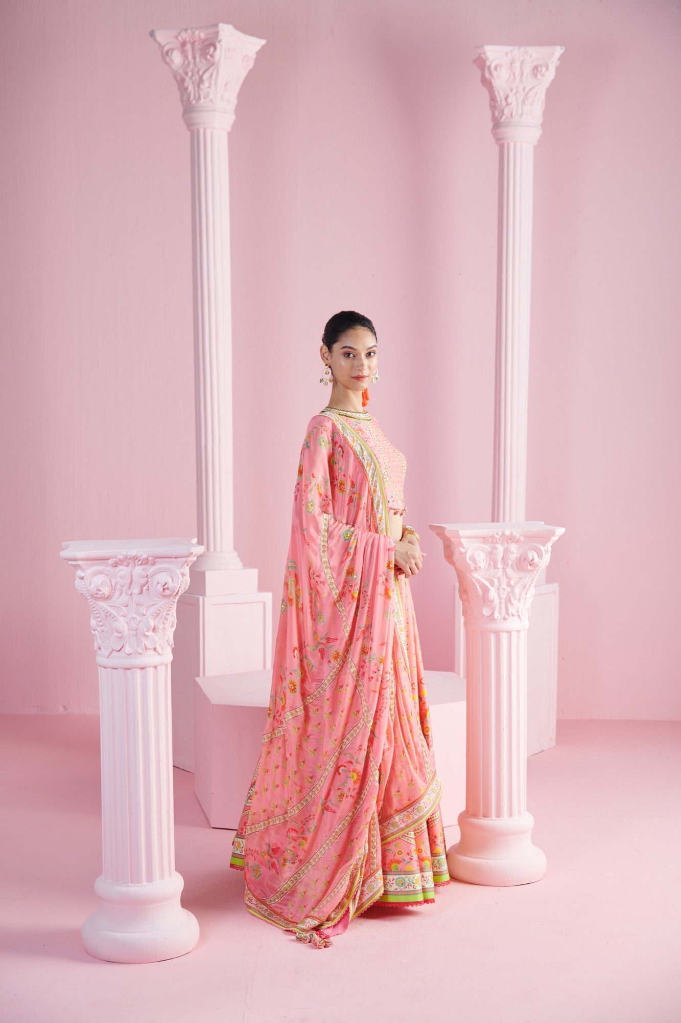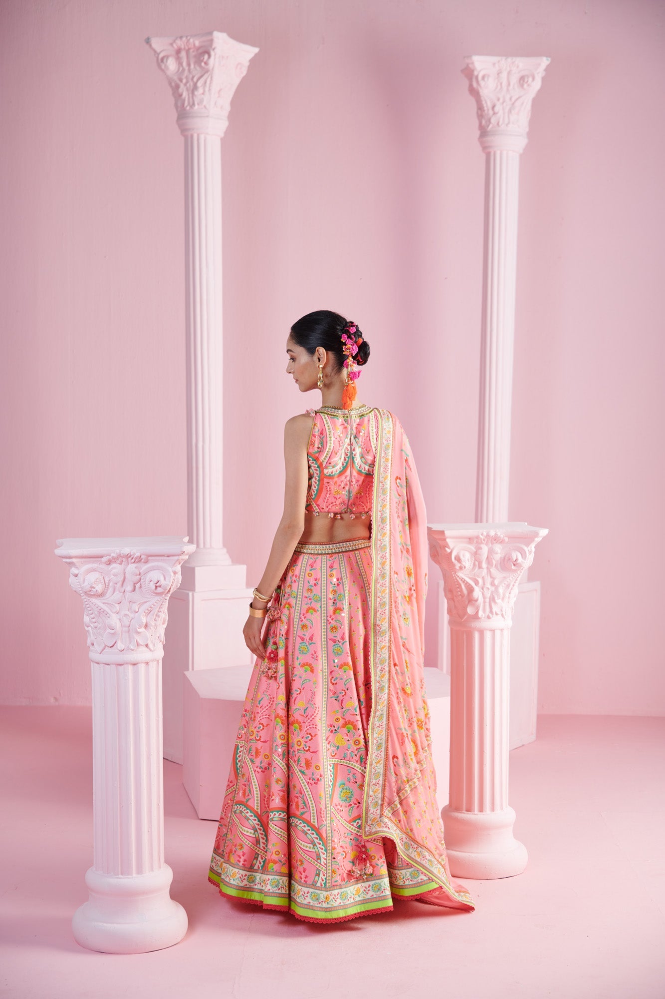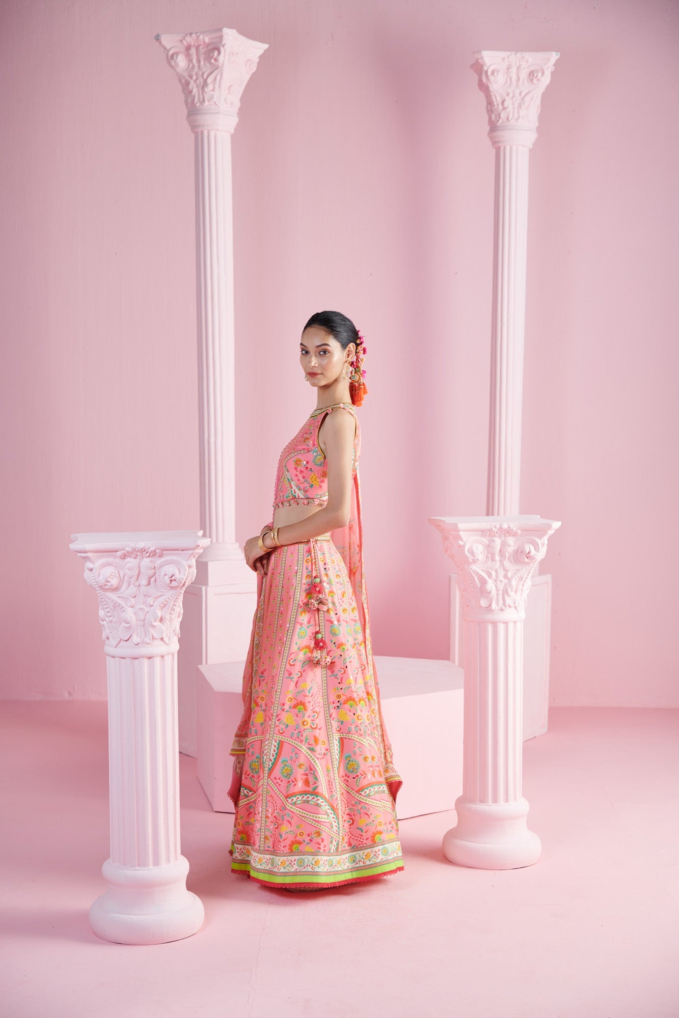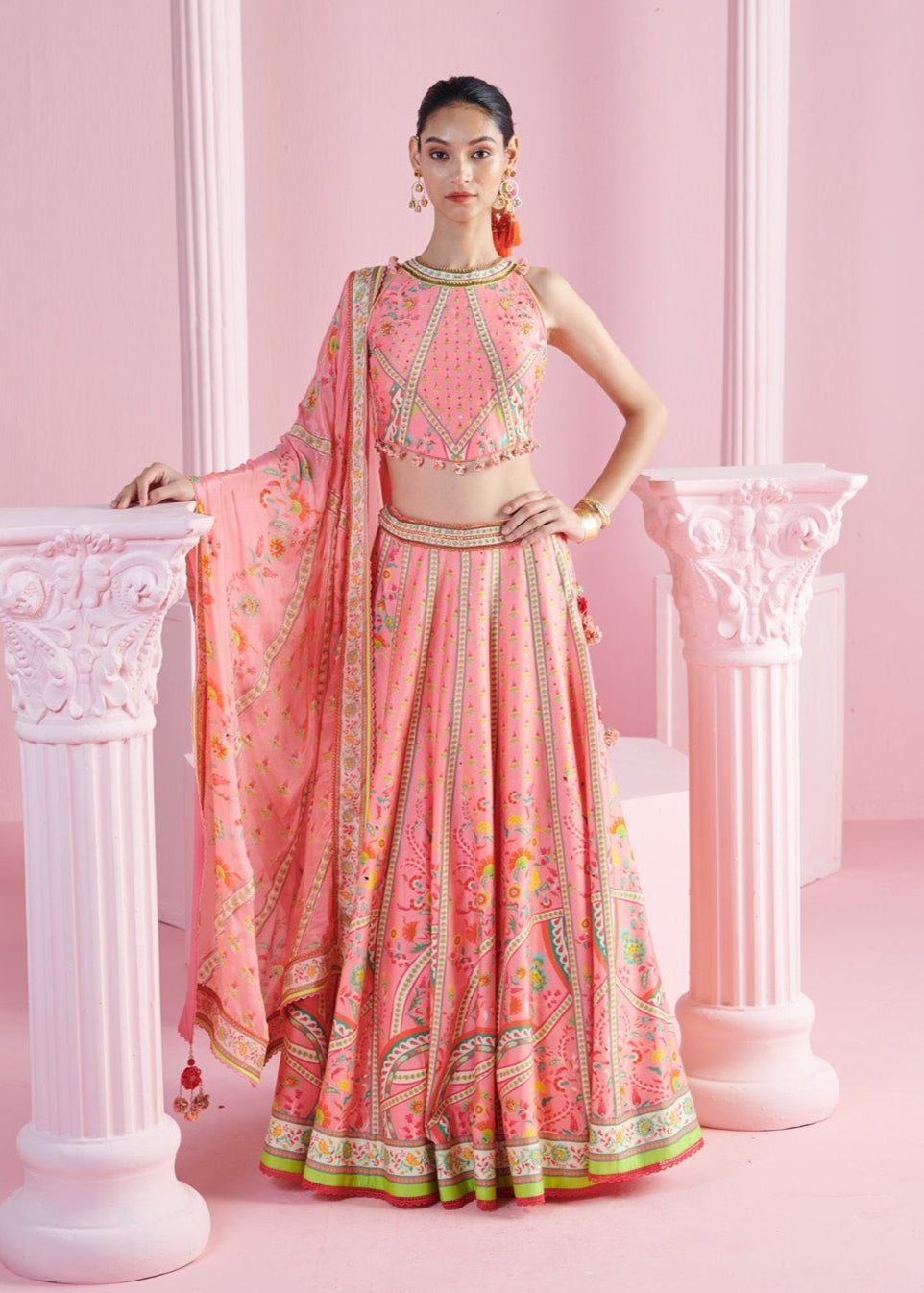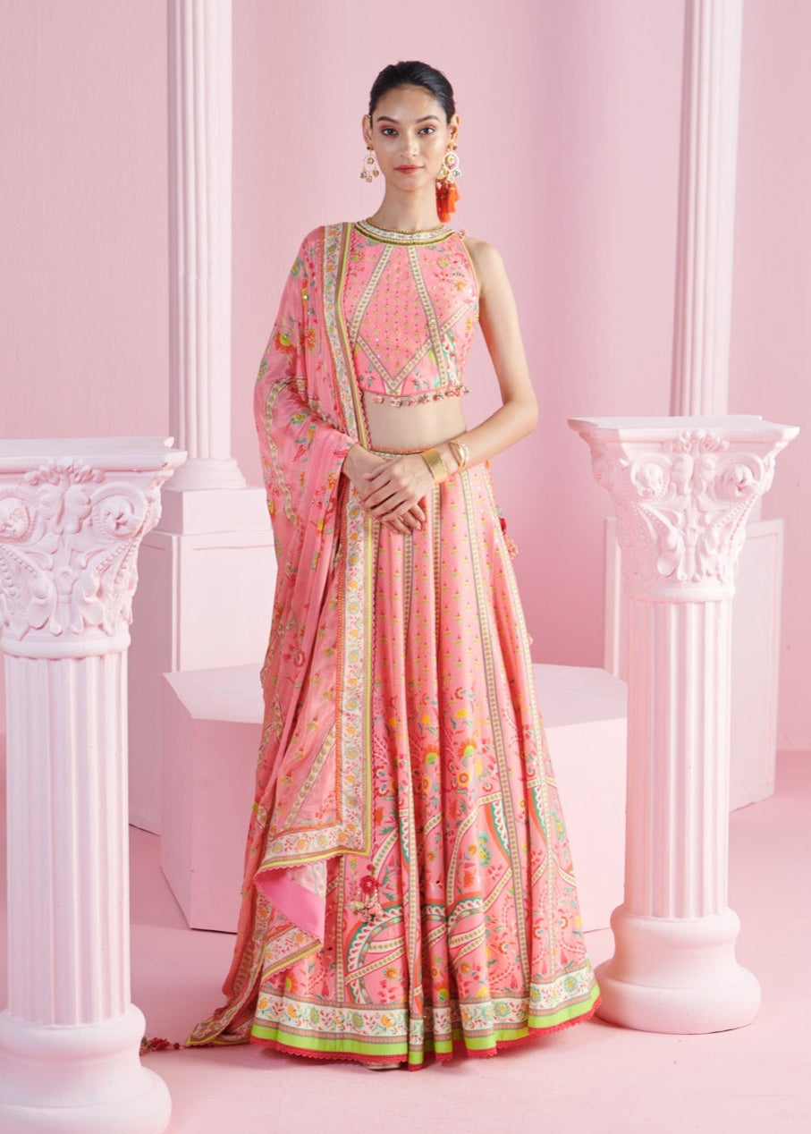 Add a splash of charm to your wardrobe with this vibrant ensemble, featuring a playful pink crop top adorned with embroidery and tassels for a touch of whimsy. The top pairs beautifully with a geometric floral printed lehenga, creating a harmonious blend of modern and traditional design elements. Completing the look is a matching dupatta, elegantly draped to enhance the overall appeal. Perfect for weddings, festivals, or special occasions, this outfit is designed to make you stand out with its bold patterns and delightful details.