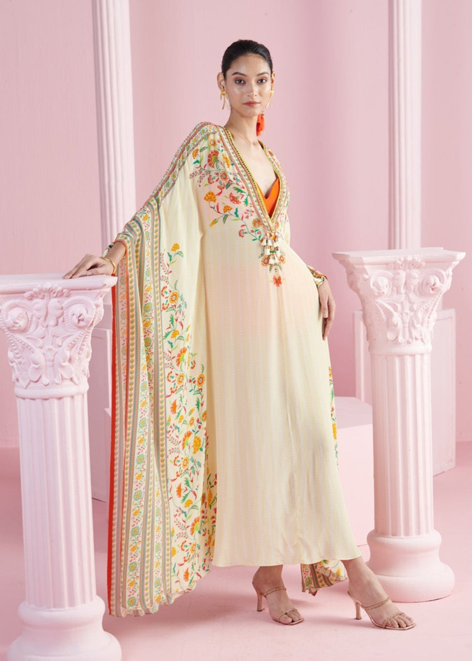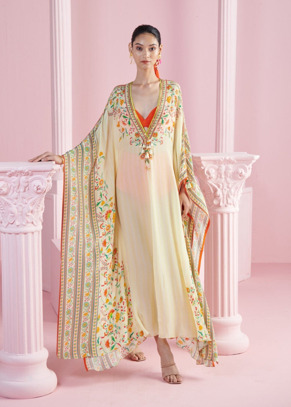 Lemon Iznik Printed Kaftan with Orange Bralette and Hipster Set. Infuse your wardrobe with a vibrant splash of color and pattern with this Lemon Iznik Printed Kaftan Set. The kaftan features a stunning Iznik-inspired print in a refreshing lemon hue along with deep v neck with embroidery detial, offering a perfect blend of tradition and modernity. Paired with an eye-catching orange bralette, this set introduces a bold contrast that adds a playful edge to the ensemble. Completing the look is a matching hipster, designed for comfort and style. Whether for a beach day or a chic lounge look, this set is all about effortless elegance with a touch of daring flair.