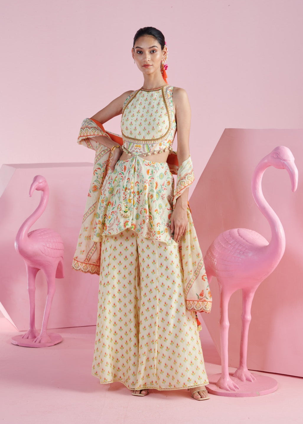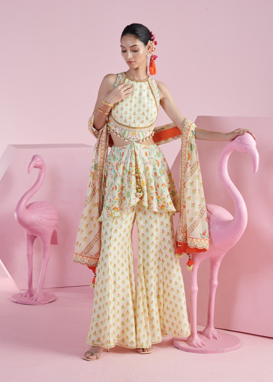 Brighten up your wardrobe with the Lemon Zest ensemble, featuring a lively lemon-printed peplum top that combines playful charm with sophisticated design. The top boasts unique cut-out detailing, decorative tassels, and fine embroidery, adding a modern twist to its classic silhouette. Paired with a matching printed sharara, this outfit offers a graceful, flowy look that enhances movement and comfort. The ensemble is completed with a coordinating dupatta, featuring complementary prints that tie the look together. Perfect for festive occasions or elegant gatherings, this set brings a fresh burst of style and vibrancy to any event.