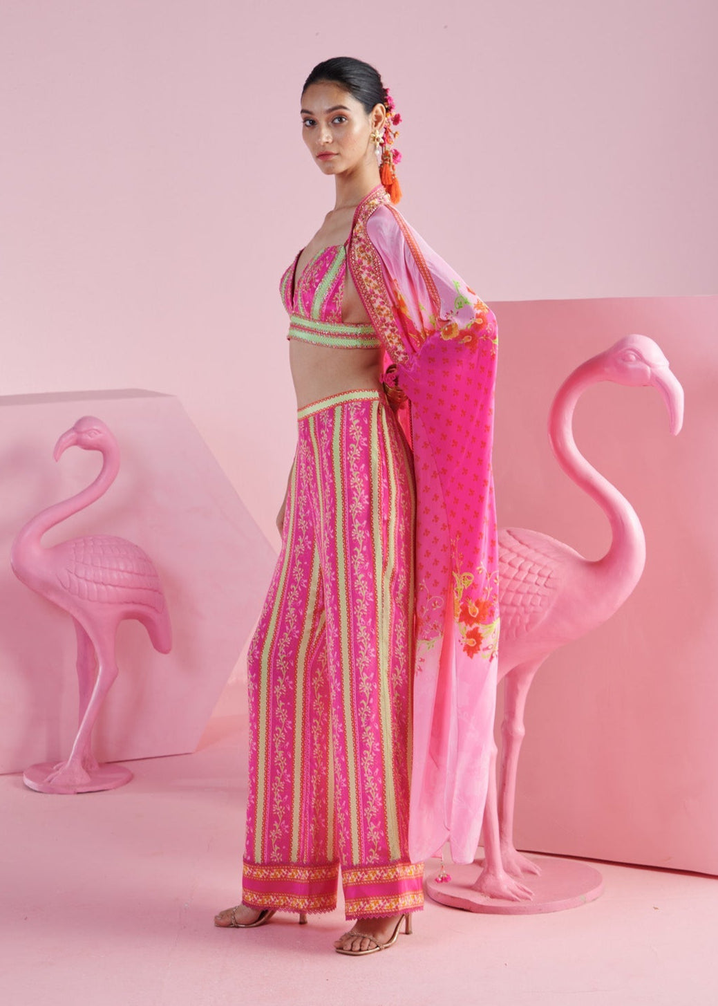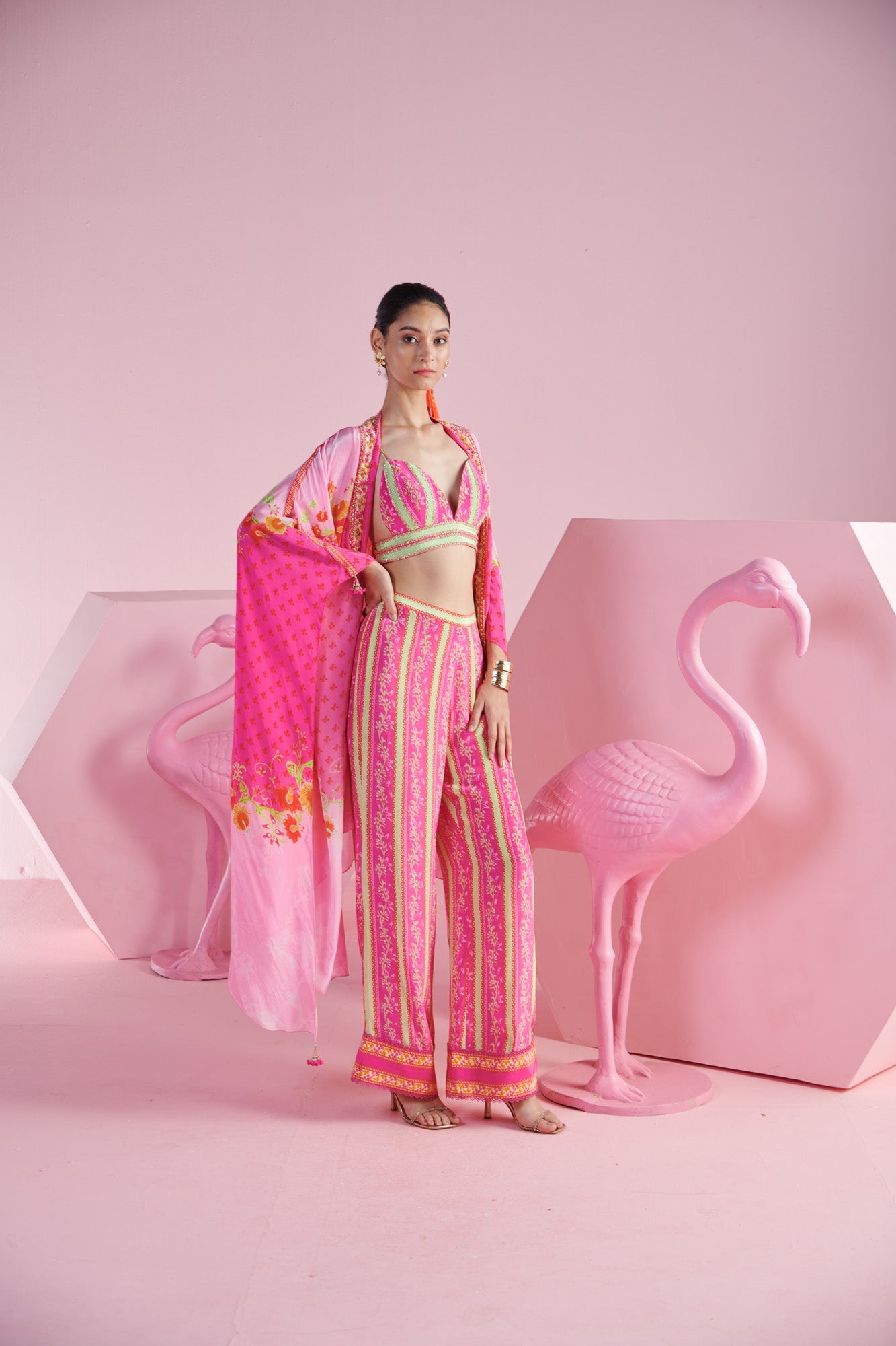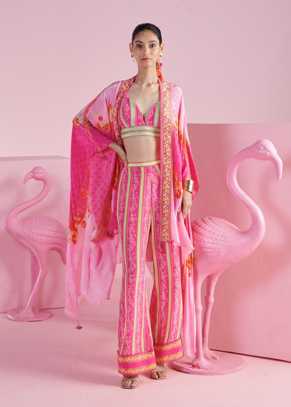 Unleash your inner style icon with the blossom cluster 3-piece set, an ensemble that perfectly balances bold prints and refined elegance. This set features a beautifully printed blouse that radiates charm, paired with striped pants that add a modern and dynamic touch. The outfit is completed with a coordinating printed shrug, elevated by intricate embroidery detailing, which adds a layer of sophistication and artistic flair. Perfect for making a statement at any event, this set combines vibrant patterns with exquisite craftsmanship for a truly standout look