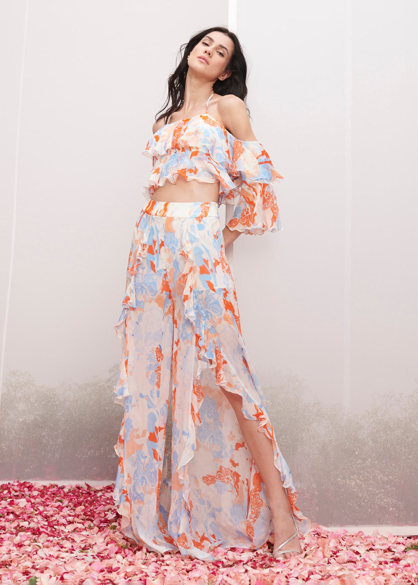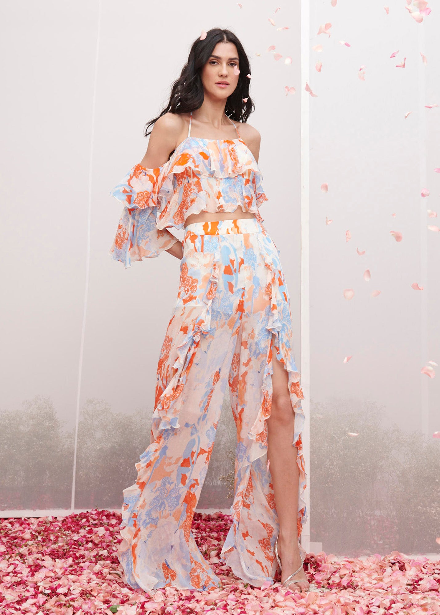 Crafted from the finest chiffon fabric, the halter neck top features a captivating tropical print in ivory and orange hues, adding a touch of exotic charm to your look. Paired with the matching printed chiffon pants with slits, this outfit exudes a sense of confidence and elegance.