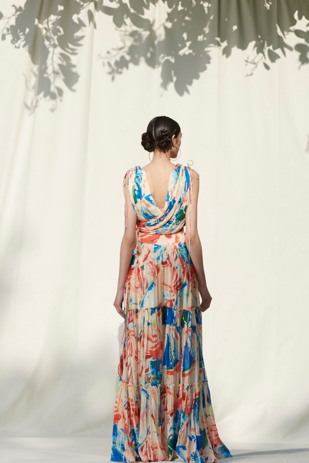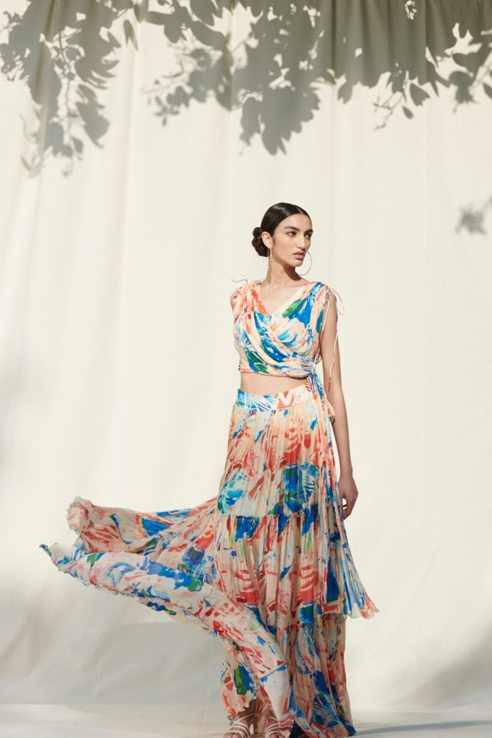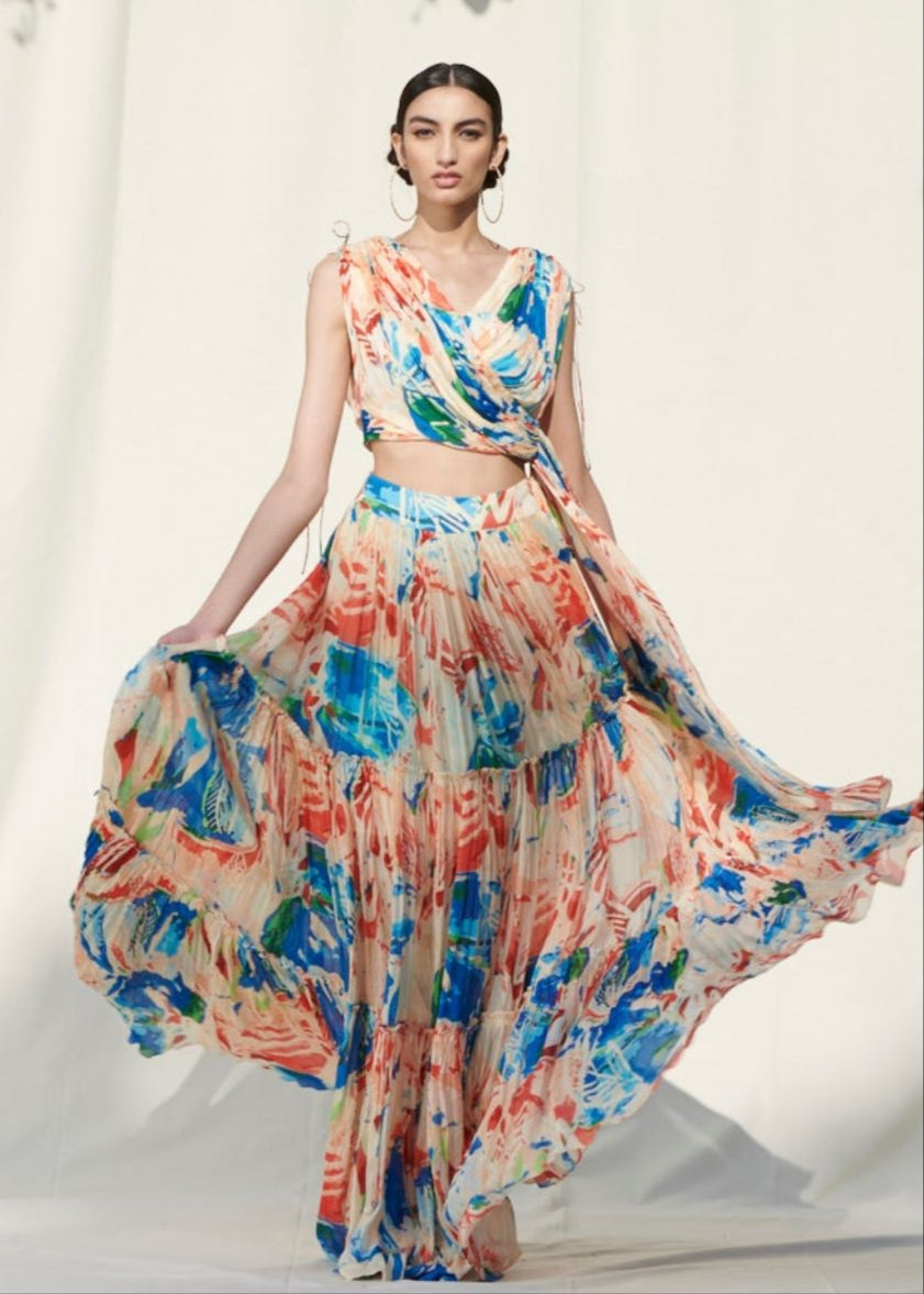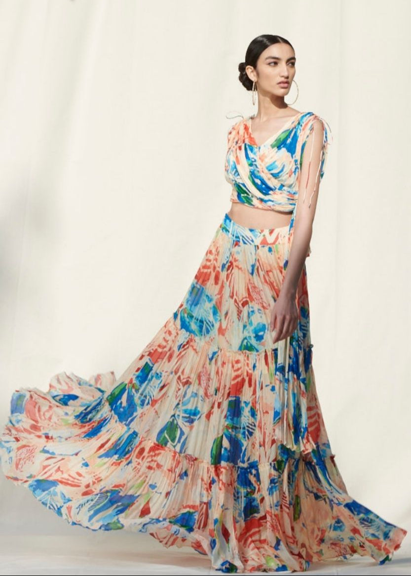 STYLING: Perfect for a whimsical garden party or a boho-chic beach wedding, the Printed Chiffon Tier Skirt paired with an Asymmetrical Draped Crop Top exudes a carefree and romantic charm