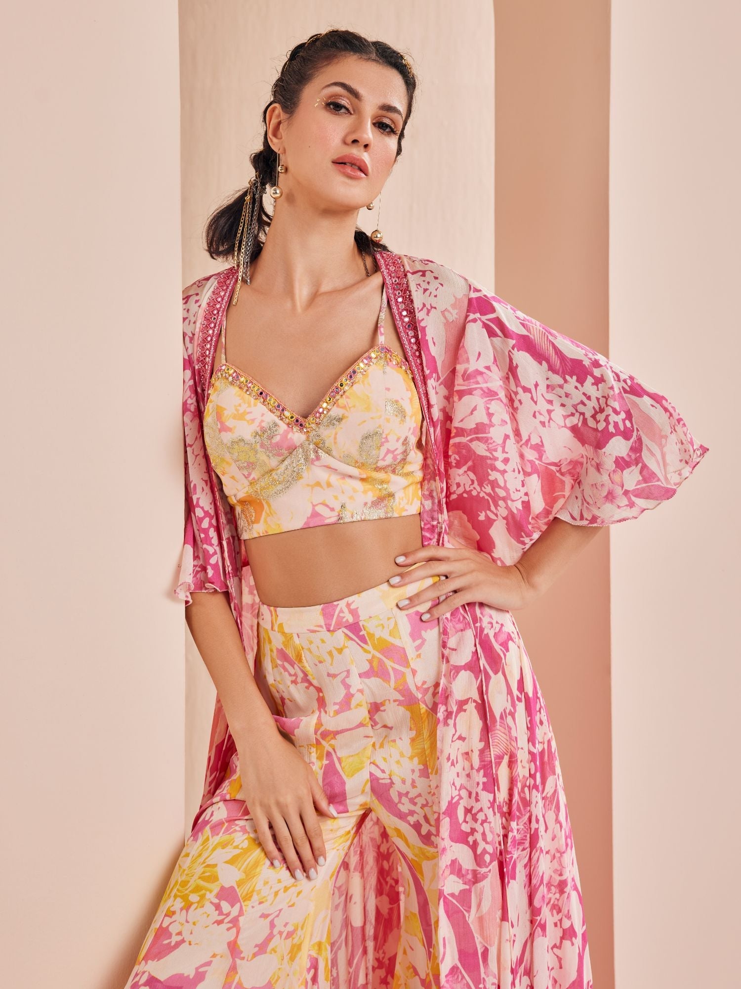 Elevate your style with this printed chiffon blouse, a piece that effortlessly blends comfort and sophistication. The blouse features an intricately embroidered neckline that adds a touch of opulence and enhances its overall charm. Paired with it is a paneled sharara that provides both comfort and style, creating a graceful and flowing look.
