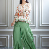 STYLING: Ideal for a cultural celebration or a festive evening event, the Printed Ivory Peasant Top paired with a Double-Layer Bias Sharara combines traditional charm with modern flair