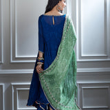 A blue printed and hand highlighted asymmetric tunic paired with dhoti and a printed dupatta. Paired with comfortable and stylish dhoti pants, this outfit offers both comfort and fashion-forward appeal.