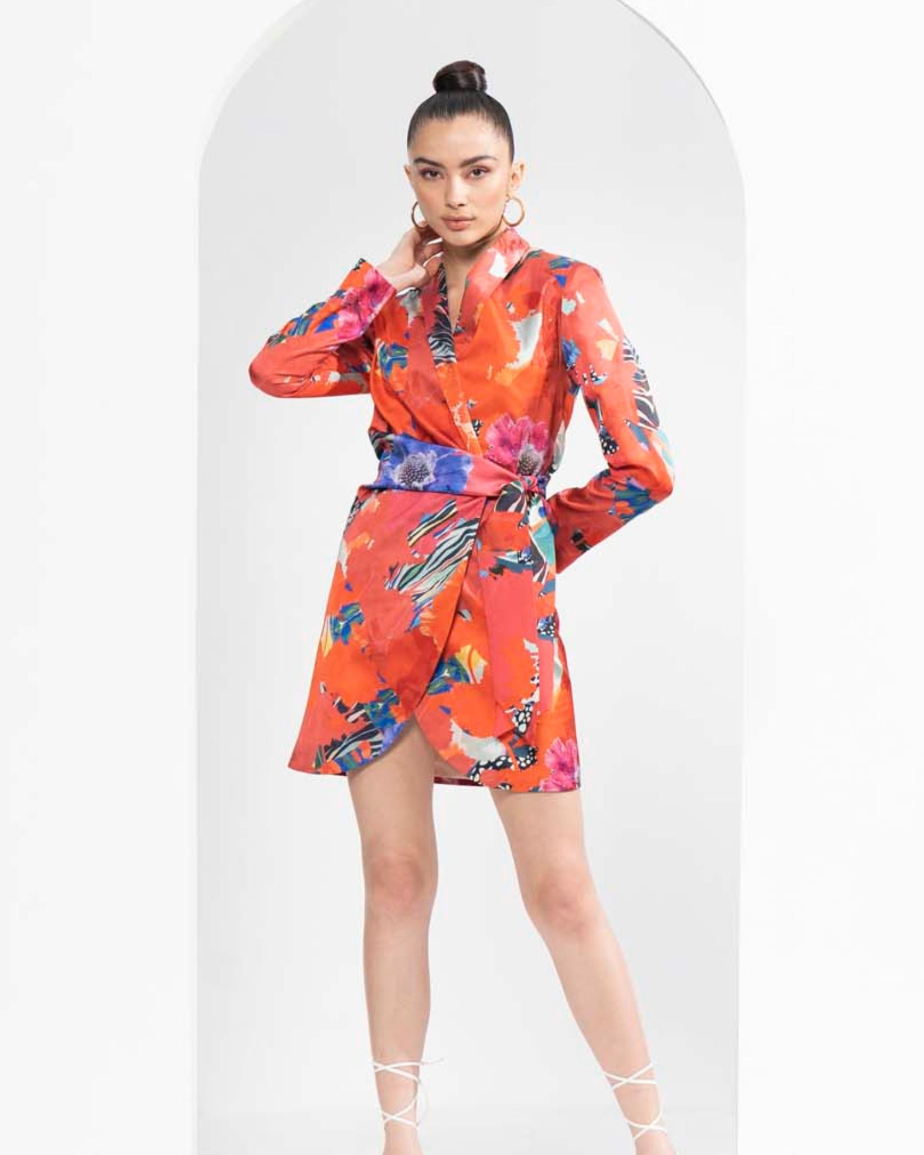 Satin red garden printed blazer dress. This bold mini dress has a wrap-around that cinches your waist perfectly.