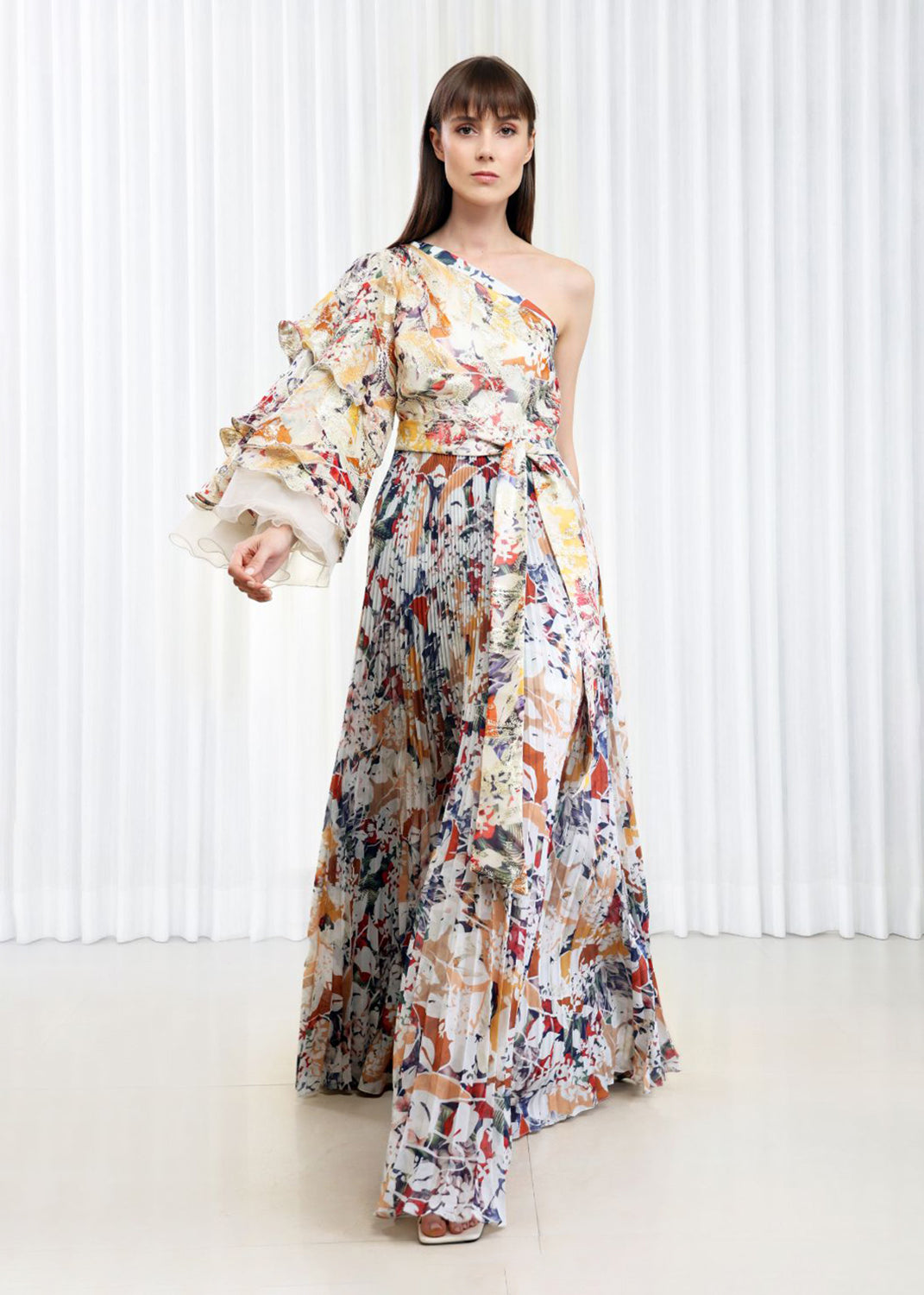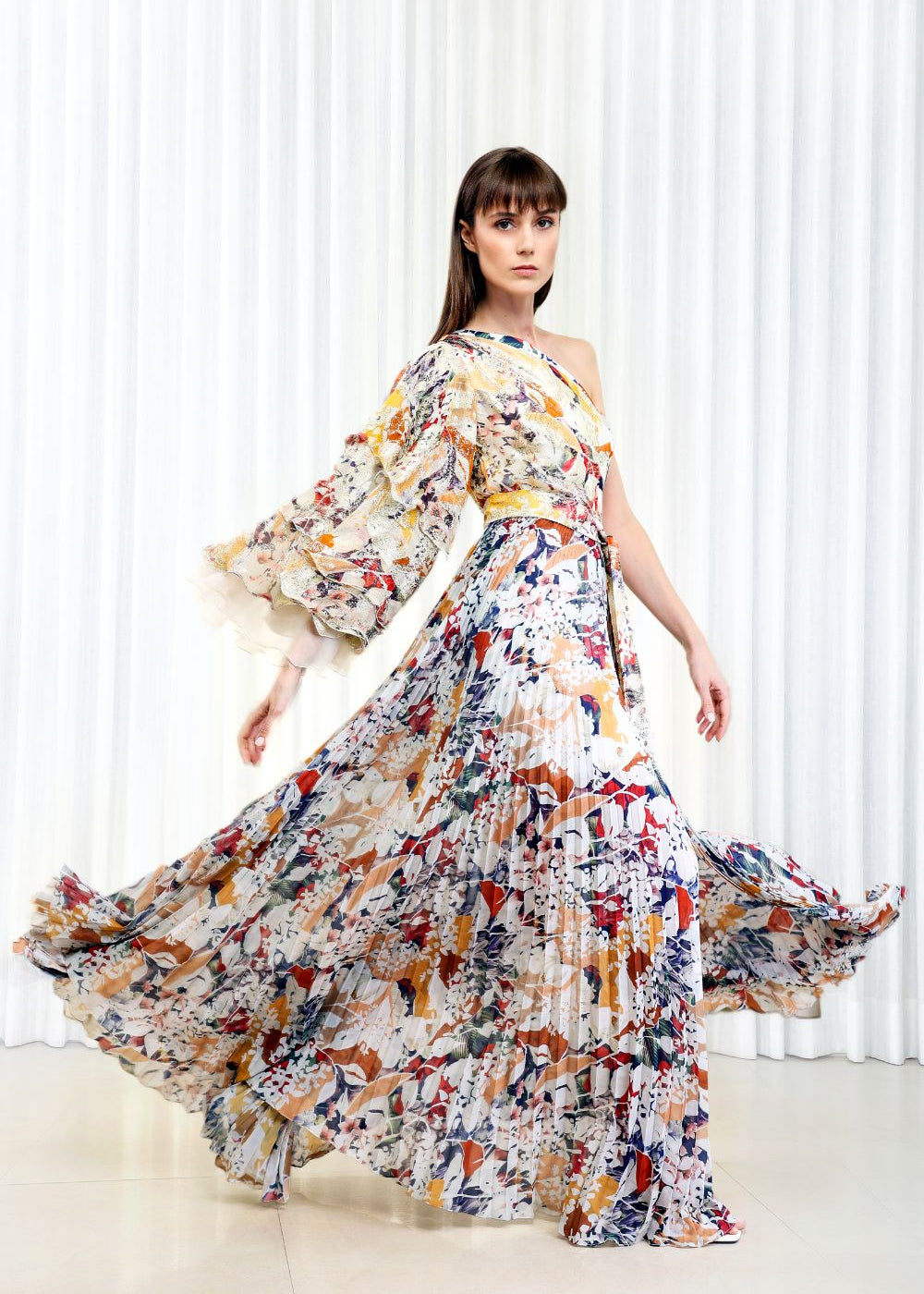 The dress showcases a captivating printed brasso pattern and heat-pleated detailing, exuding contemporary elegance and charm.