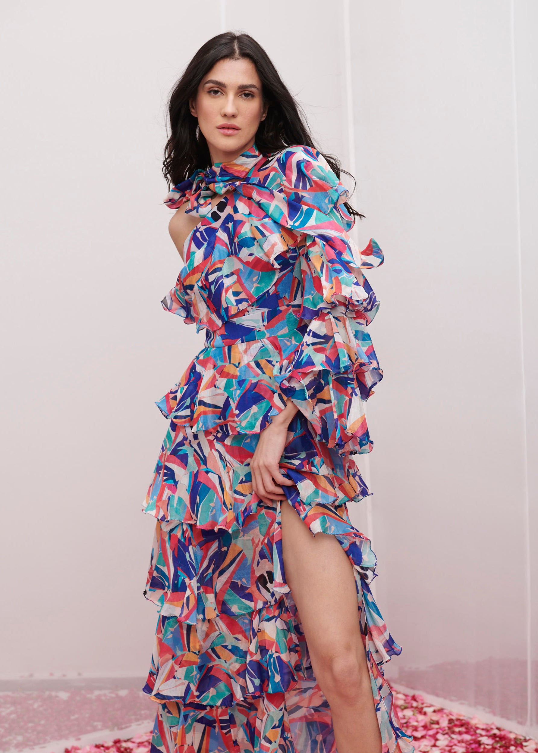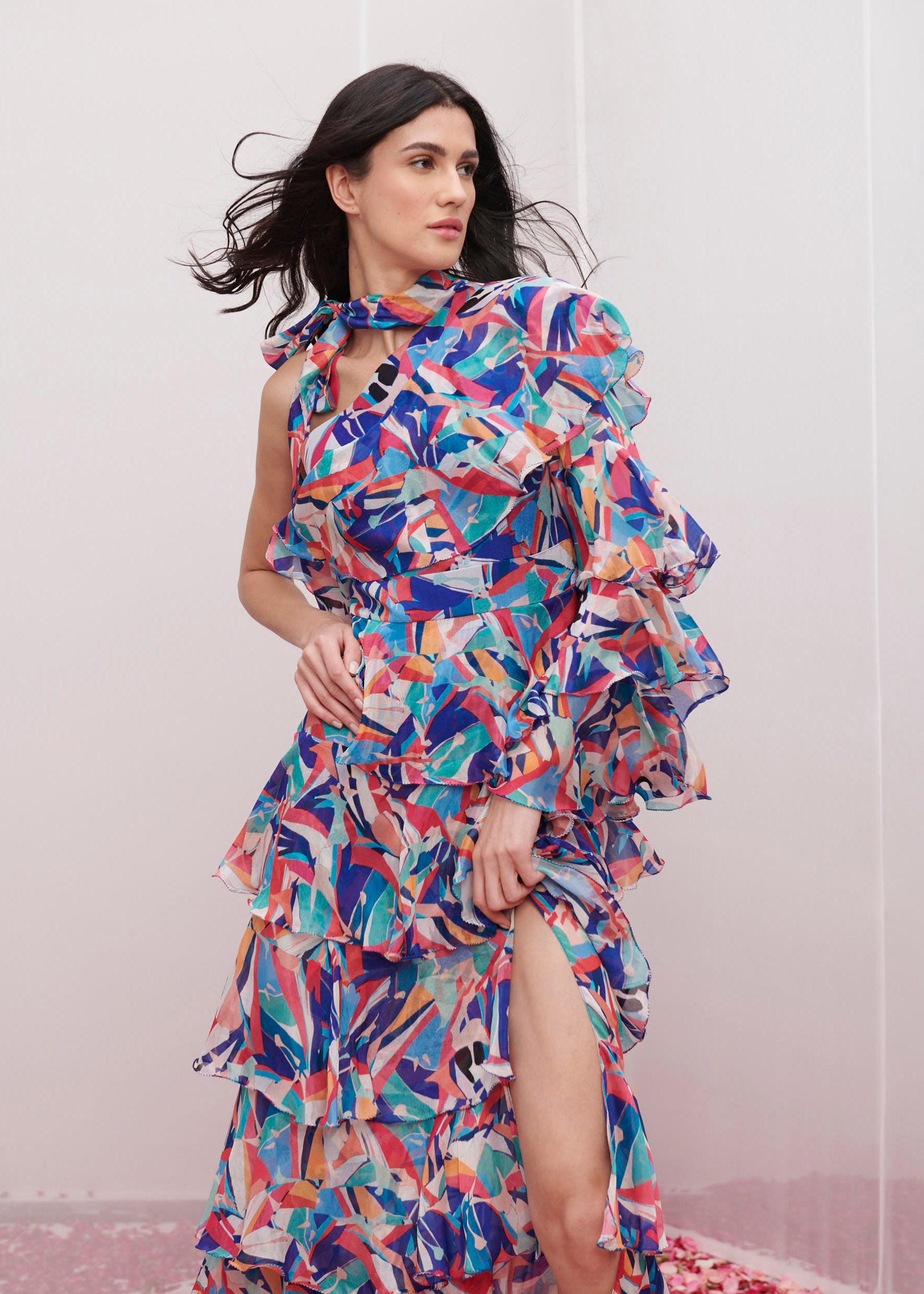 This captivating dress features a delightful geometric print, meticulously crafted from luxurious chiffon fabric. The one-shoulder design exudes modern elegance, while the neck tie-up detail adds a touch of flair and allure.