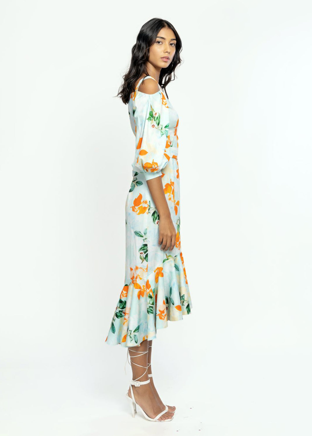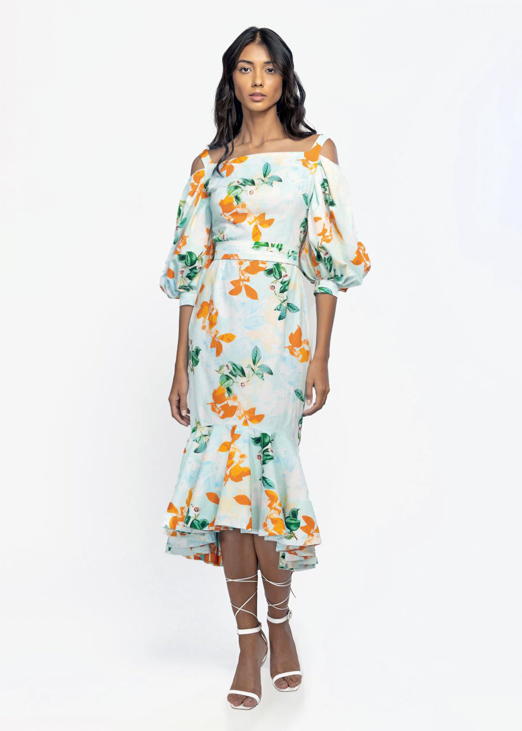 This stunning dress showcases the perfect blend of style and comfort, reflecting the designer's passion for creating fashionable masterpieces. The aqua floral print on the finest cotton fabric exudes elegance and sophistication, making it a must-have addition to your wardrobe.