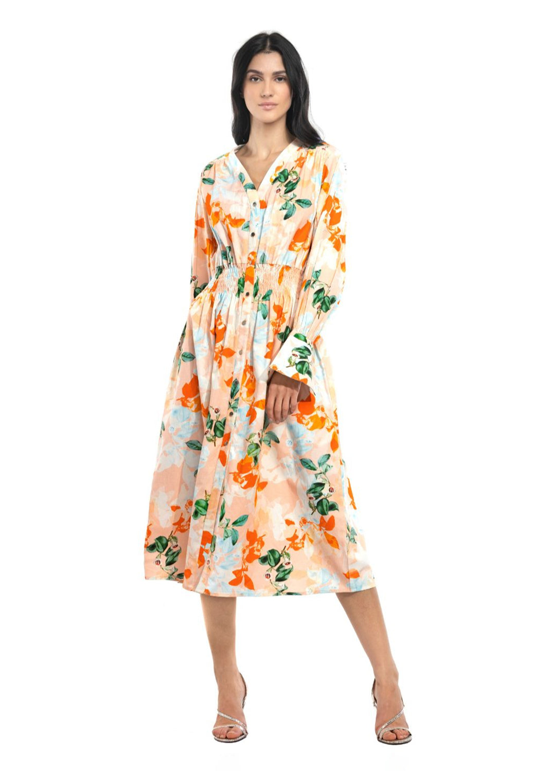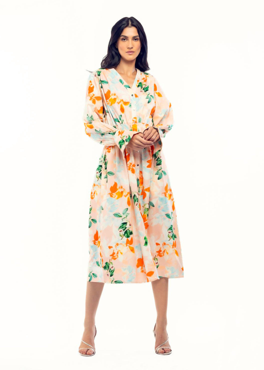 This enchanting dress captures the essence of feminine charm and elegance, showcasing the designer's exceptional eye for fashion. The peach floral print on premium cotton poplin fabric exudes a sense of grace and sophistication, making it a delightful addition to your wardrobe.