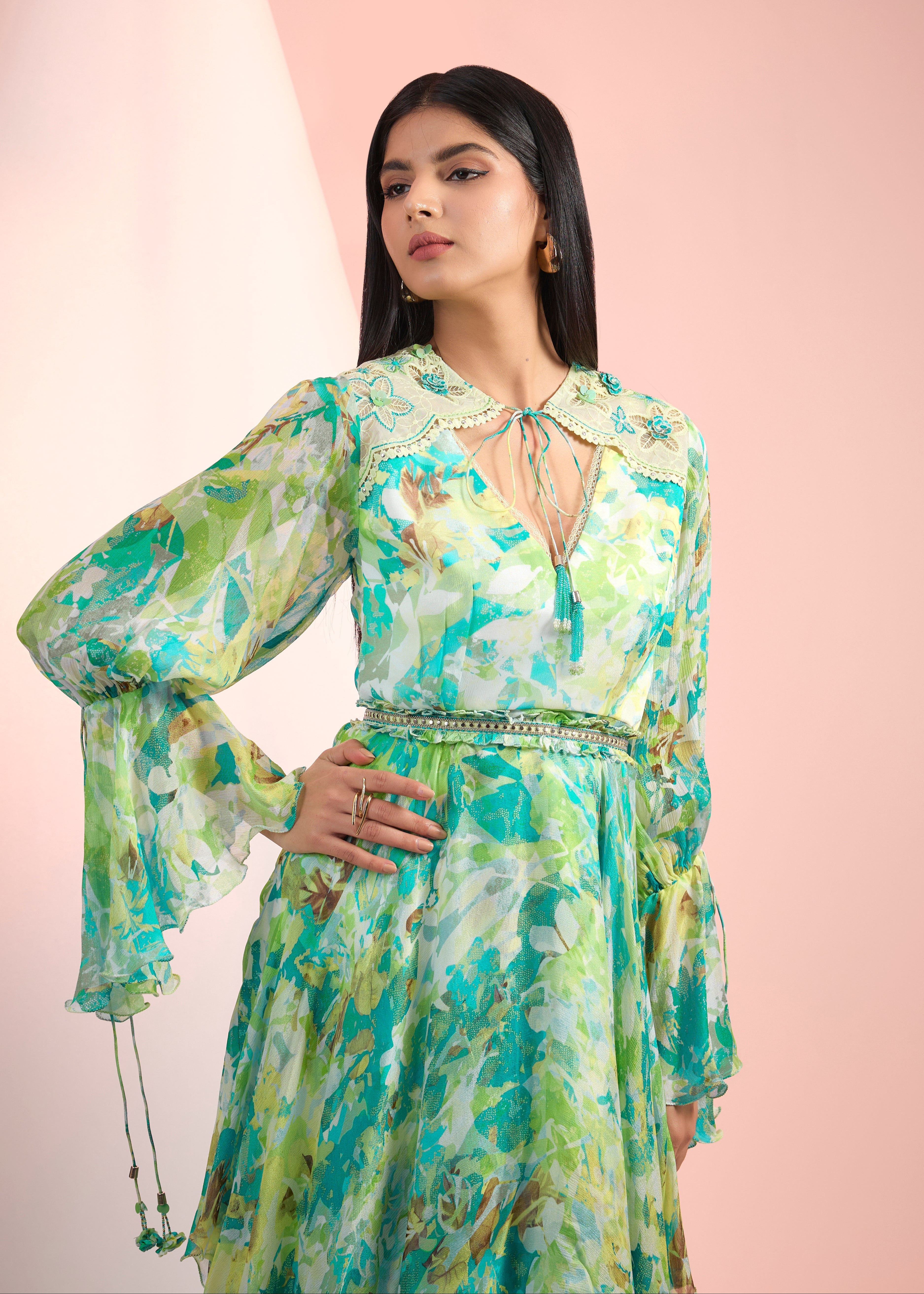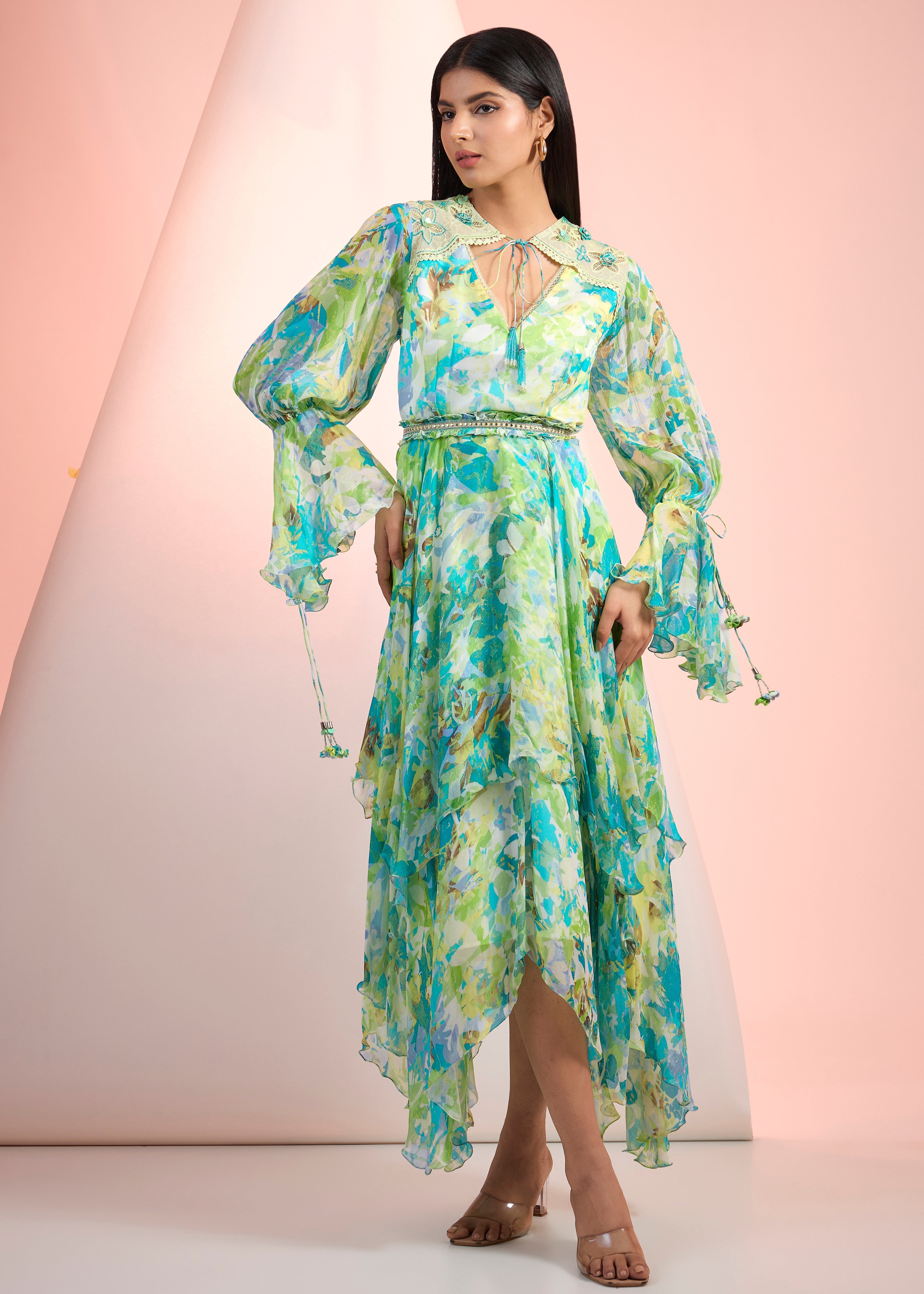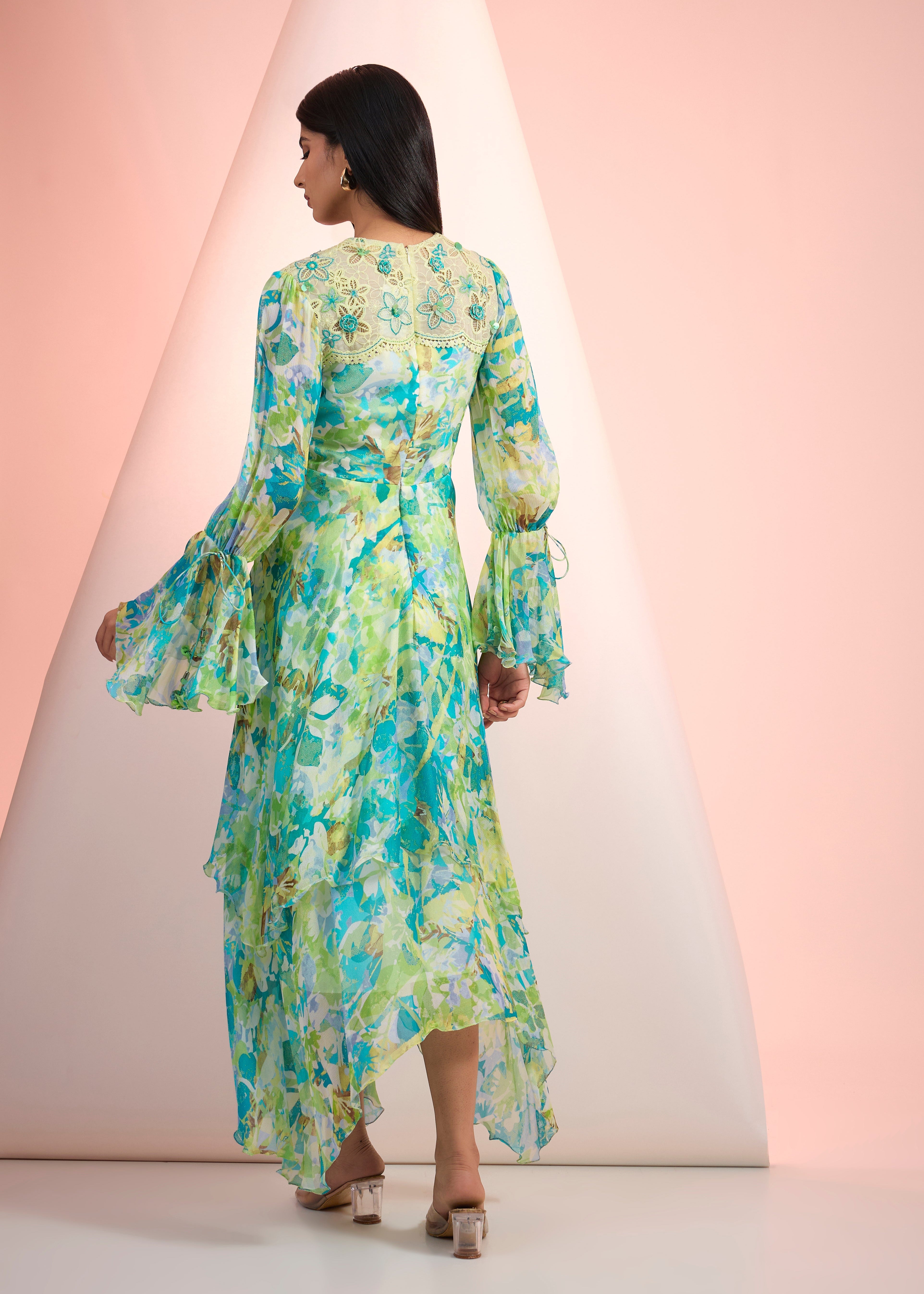 Asymmetrical hem dress with cut work and hand embroidery detailing on shoulder.