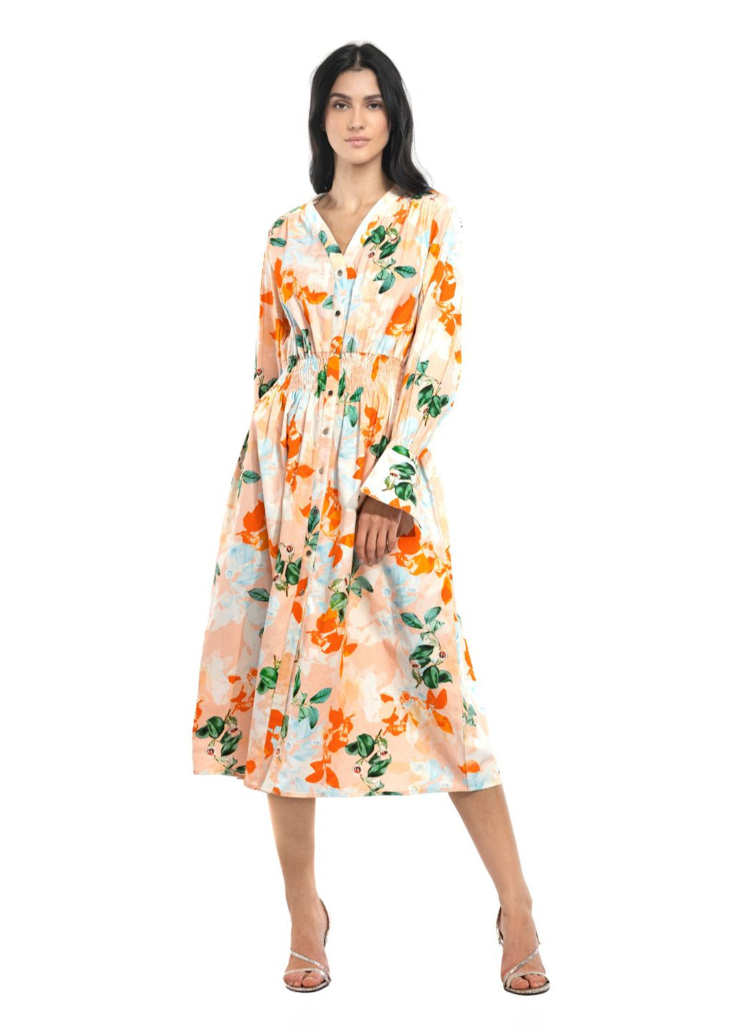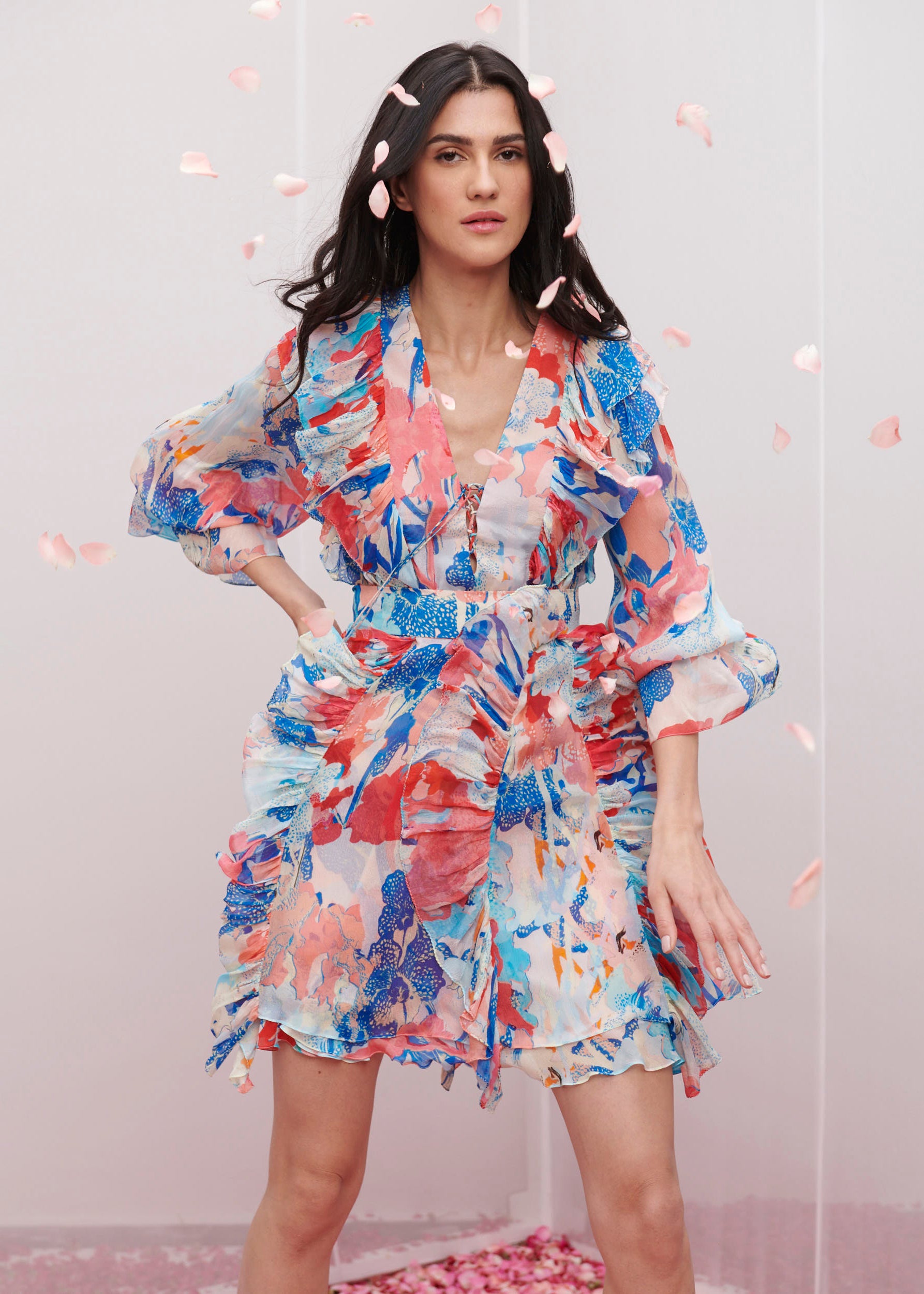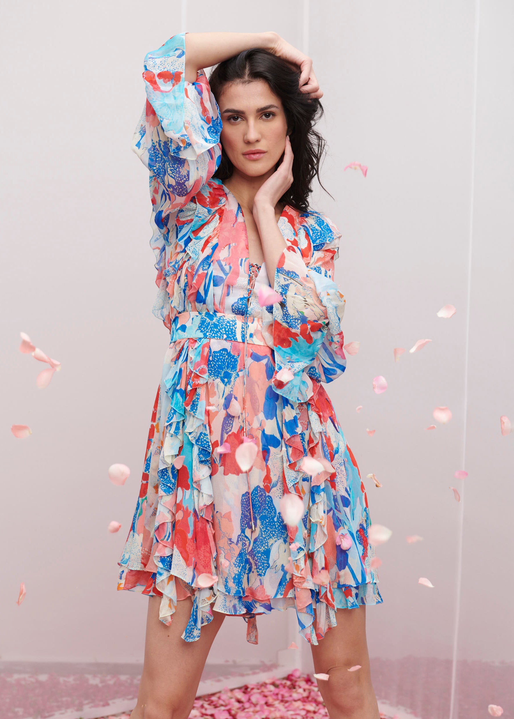 Hibiscus Printed Brasso and Chiffon Ruffled Dress