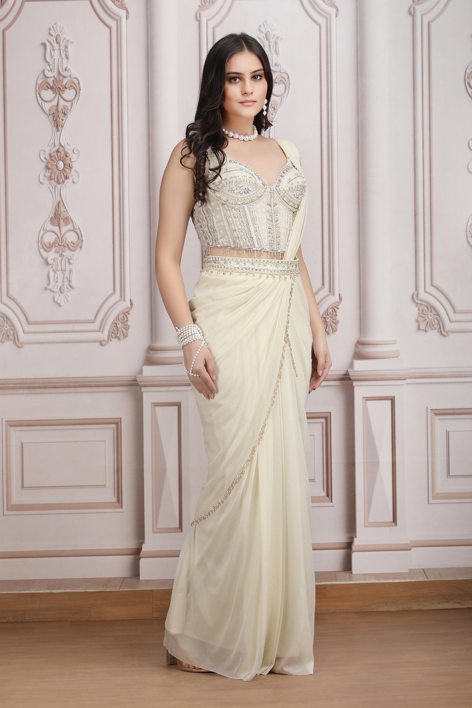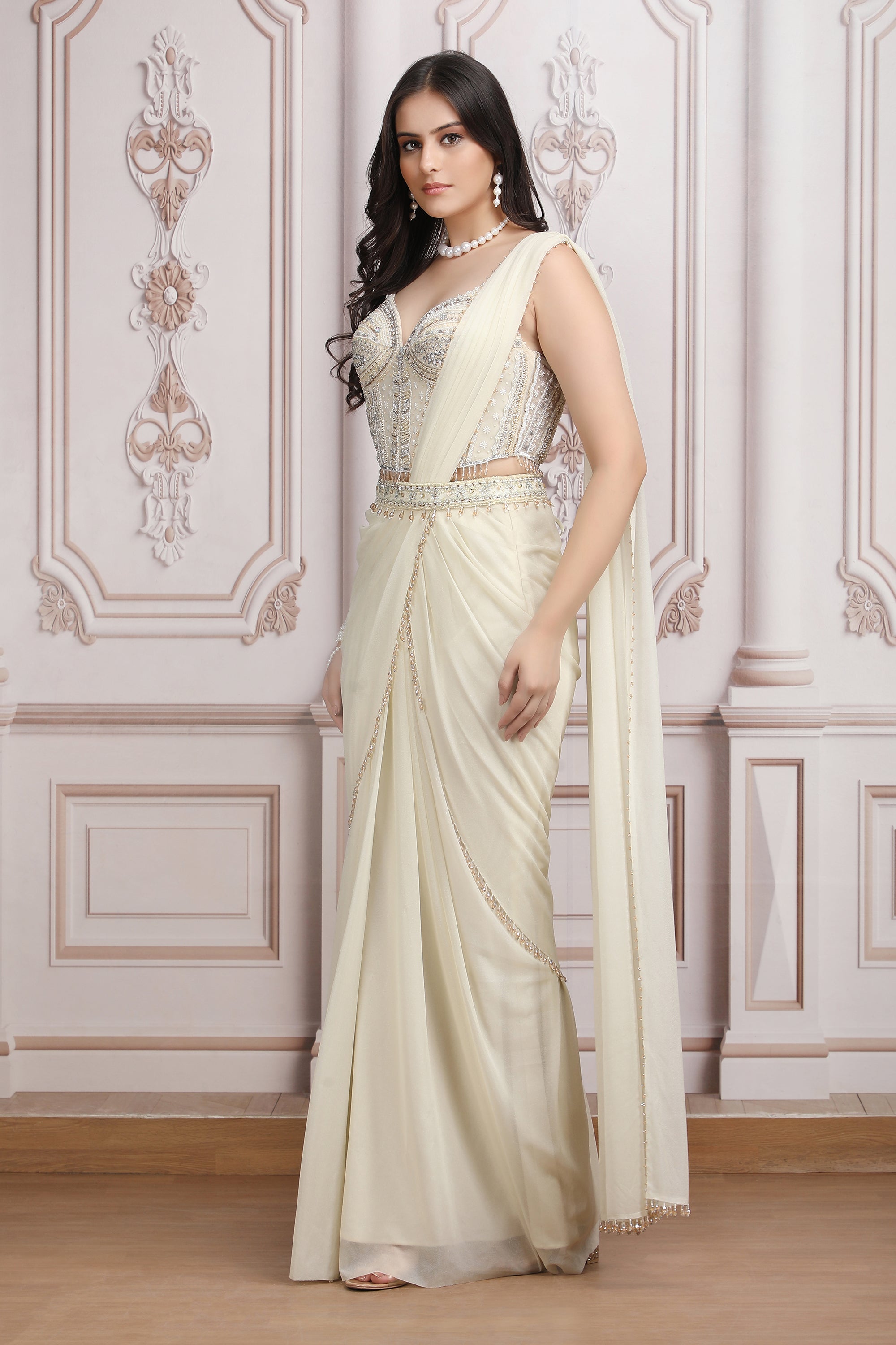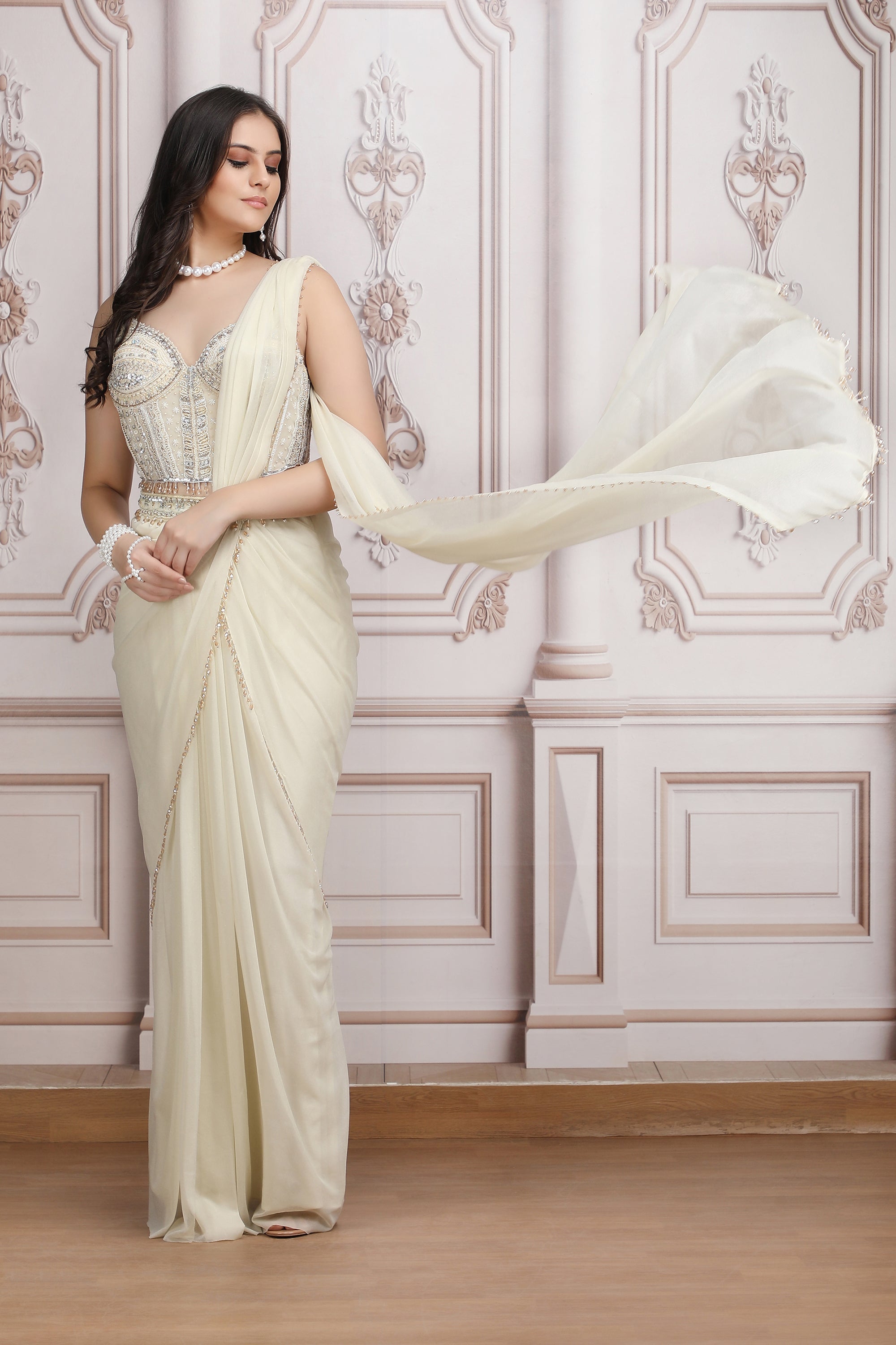 A fluid ivory saree paired with a structured, embellished corset blouse — blending timeless drape with modern allure for a statement of refined sophistication.