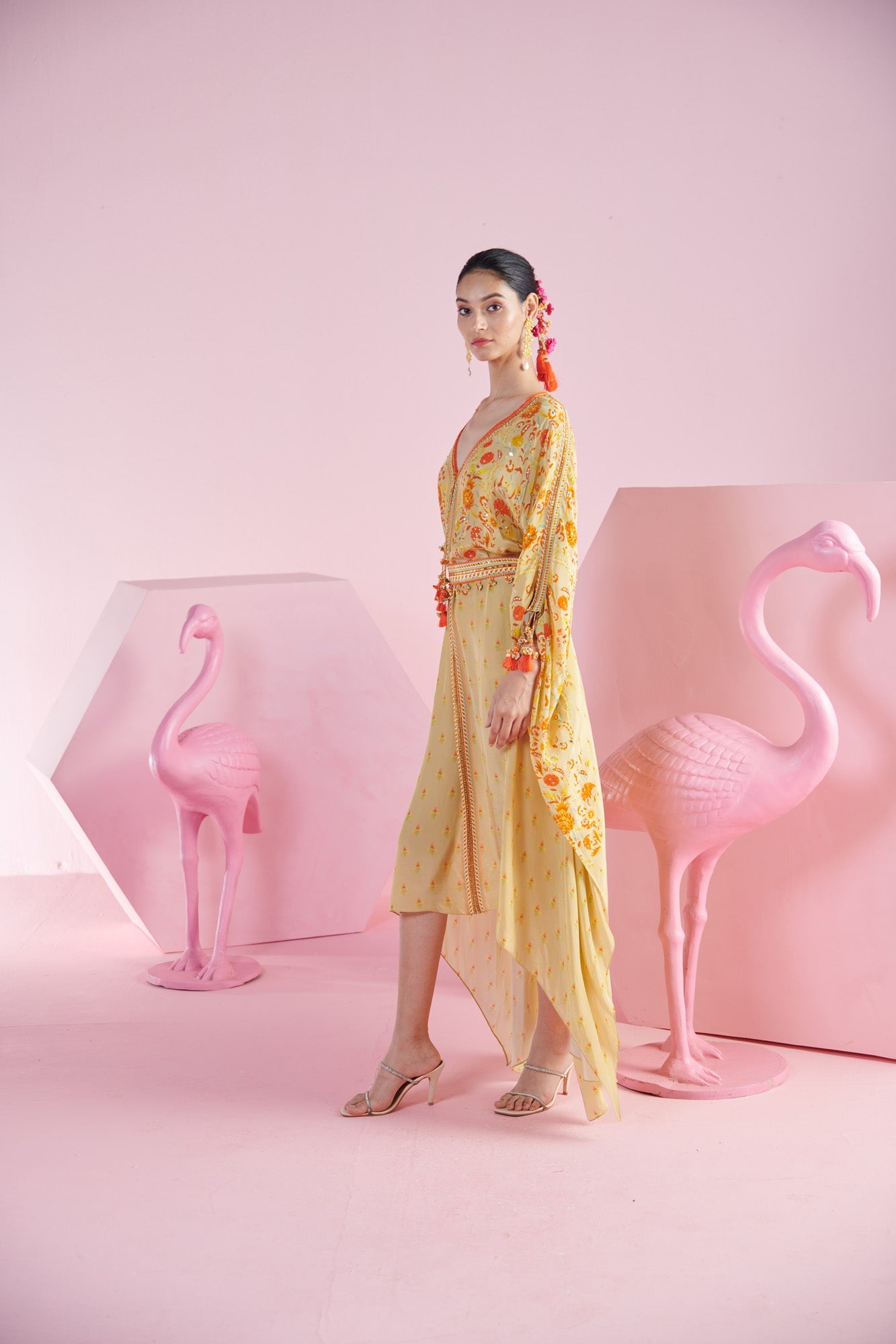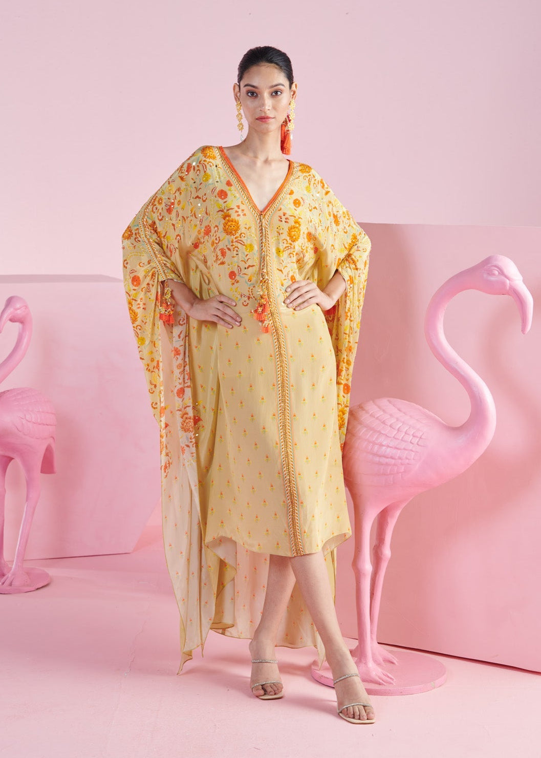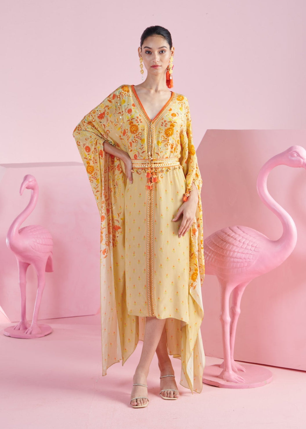 Step into effortless style with this eye-catching yellow ochre kaftan dress. Featuring a captivating geometric floral print all over, this dress combines modern artistry with a timeless silhouette. The relaxed fit offers unparalleled comfort, while the flowy fabric creates an ethereal drape. The highlight of this ensemble is the heavy embroidered belt, adorned with intricate patterns and finished with playful tassels. Cinching the waist for a flattering fit, the belt adds structure and a touch of bohemian elegance. Perfect for any occasion, this kaftan dress is a versatile addition to your wardrobe, promising to make a lasting impression.