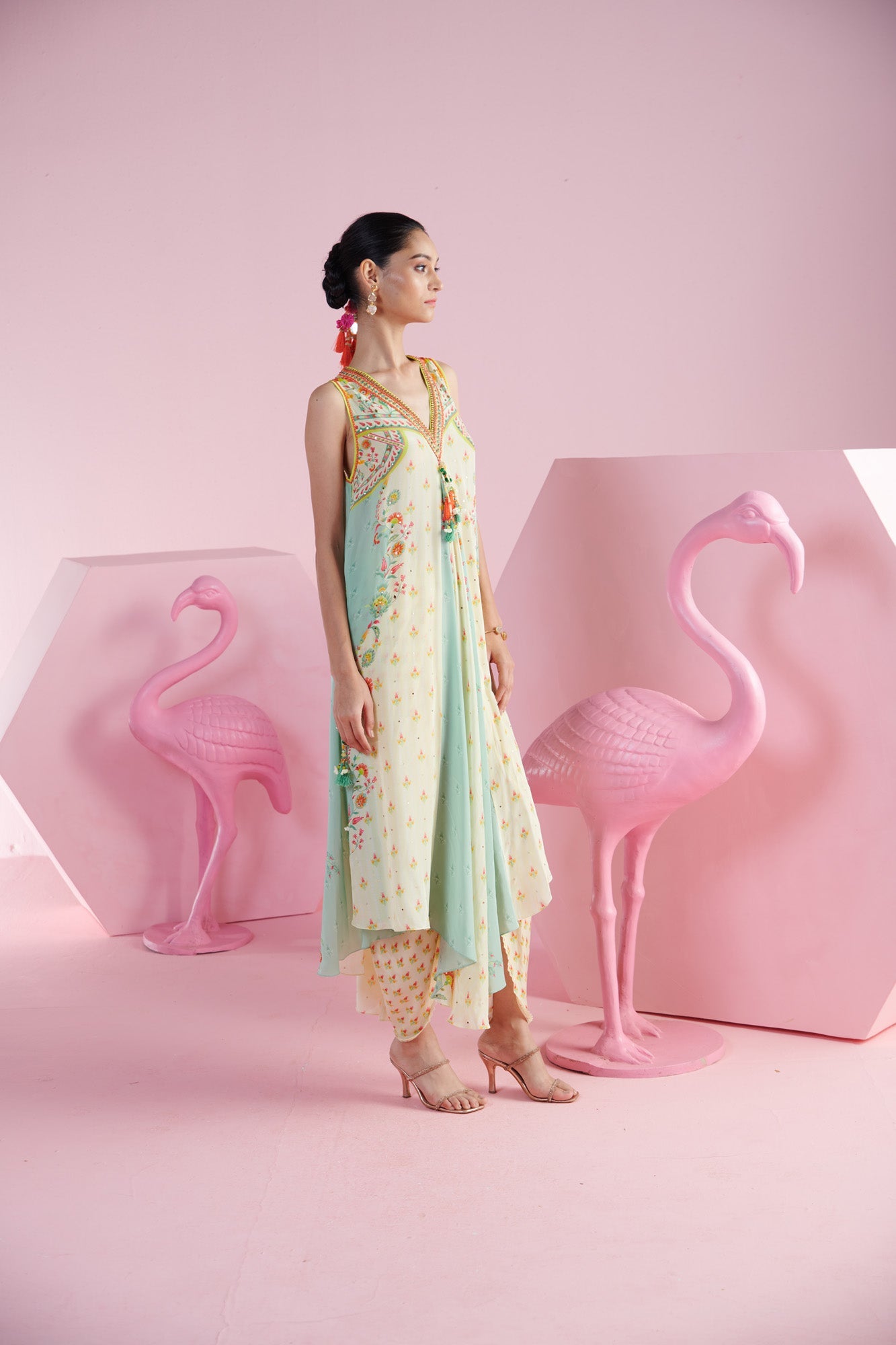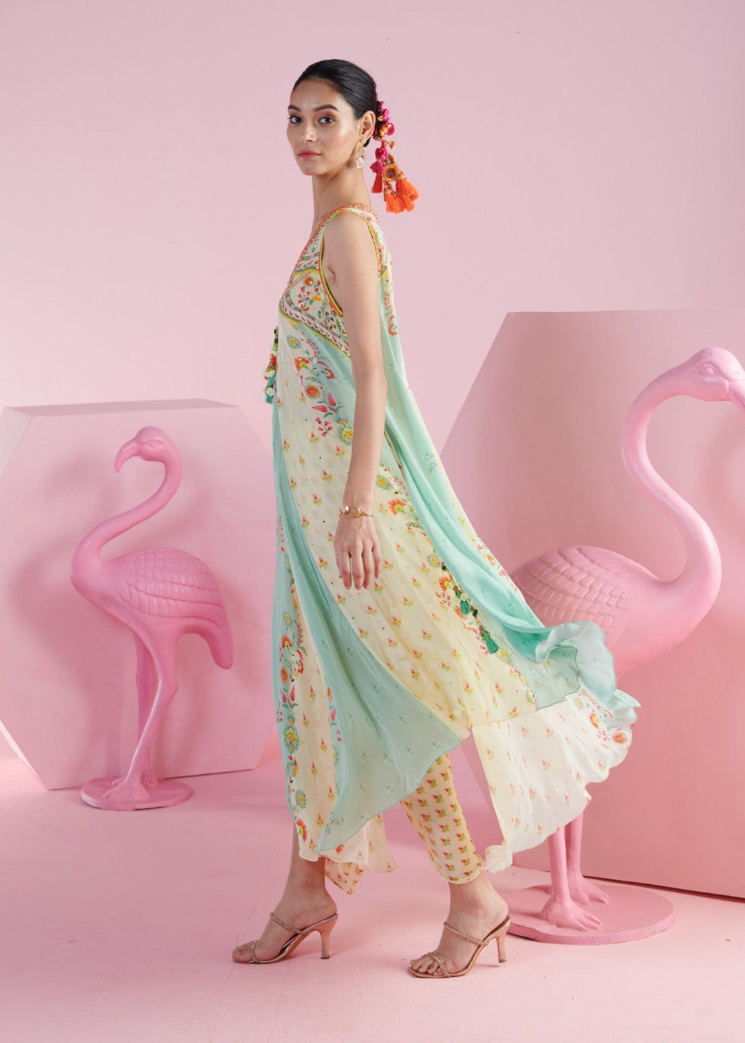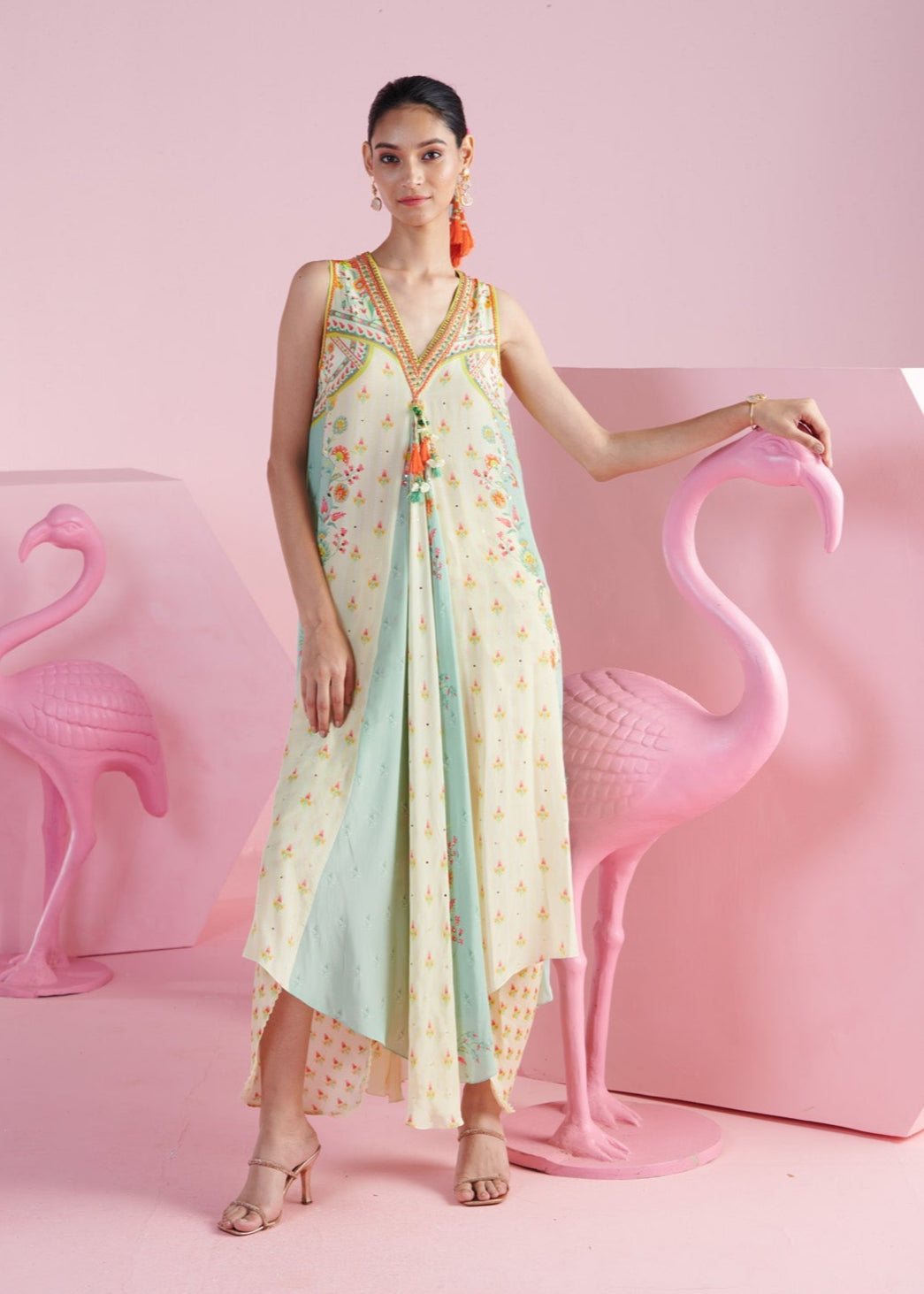 Make a stylish statement with this jade and cream asymmetrical panel dress, designed to turn heads. This dress features a unique asymmetrical cut that adds modernity and flair, while the Placement print brings a vibrant touch to the ensemble. The dress is crafted with a lot of flare, creating a flowing and dynamic silhouette that moves gracefully with every step. The v neck has an embroidered detail and tassels which adds a lot of depth on the neck. The combination of jade and cream panels enhances the visual appeal, making this dress perfect for any special occasion or a fashionable day out. Embrace the blend of elegance and contemporary design with this must-have addition to your wardrobe.