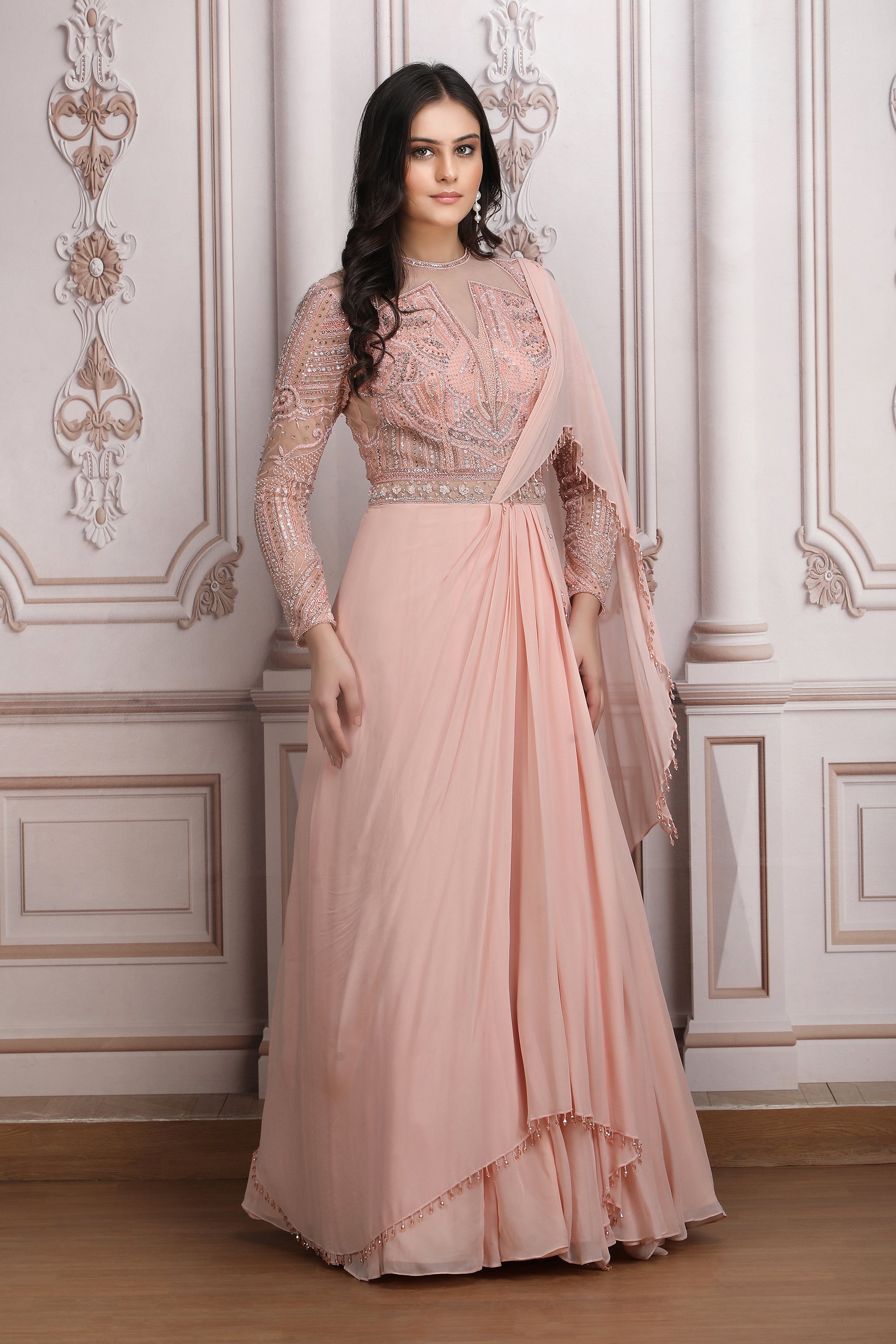 This graceful blush pink gown features delicate embroidery on the bodice and sleeves, paired with soft, flowing layers that add ethereal charm. Finished with a matching dupatta and subtle embellishments, it’s perfect for weddings, receptions, or elegant festive gatherings.