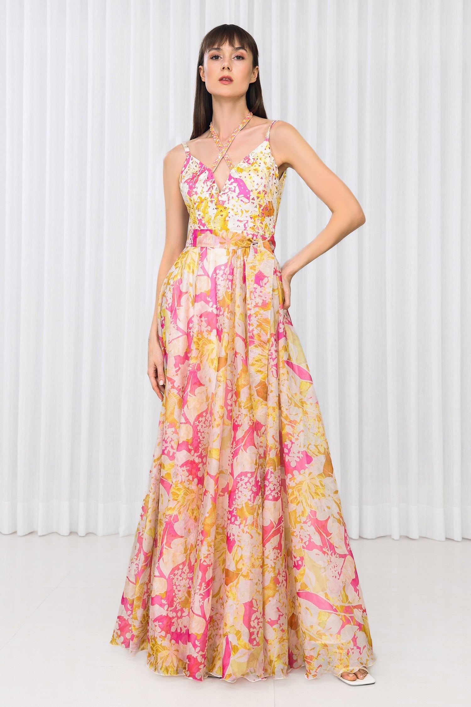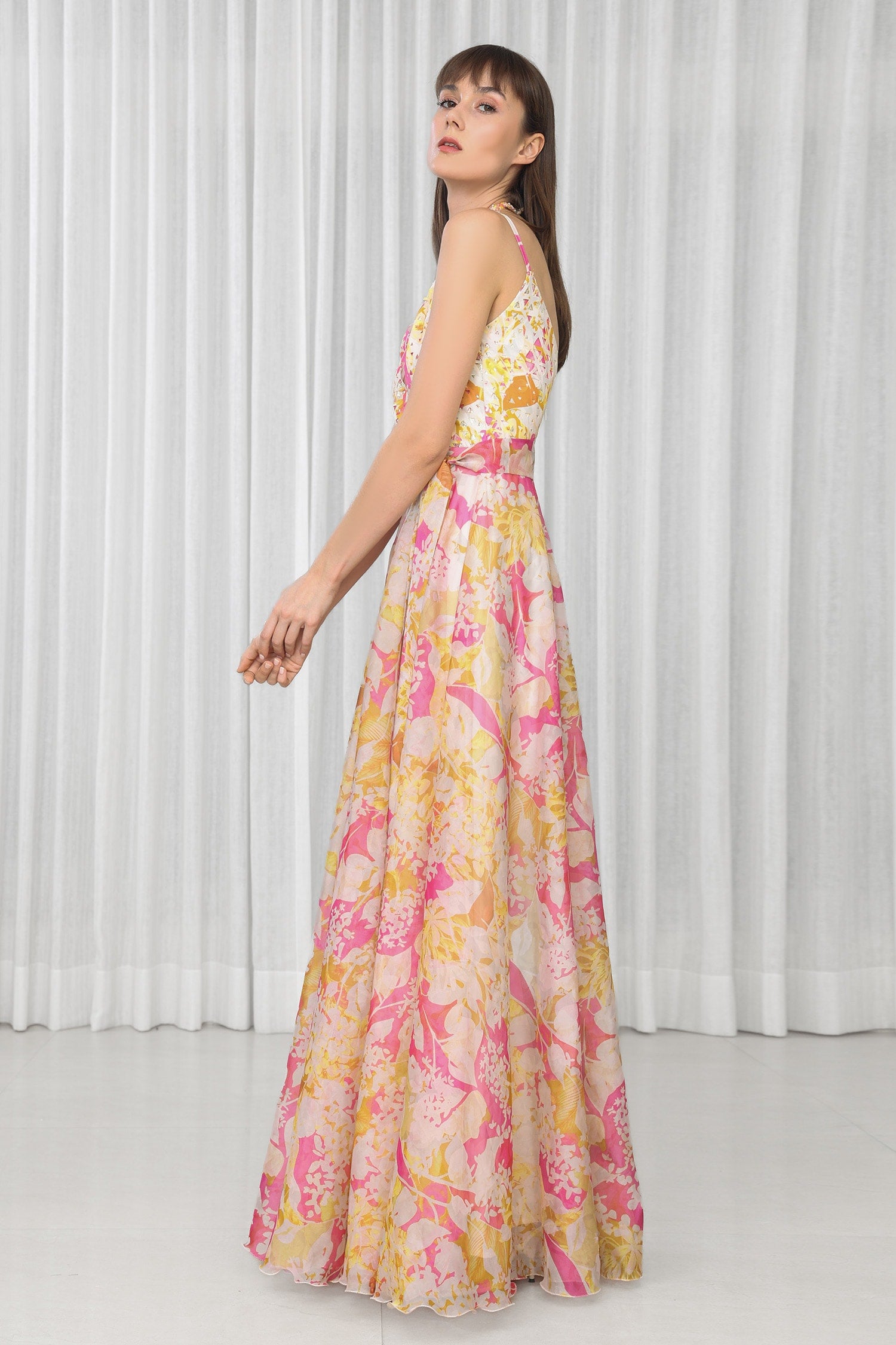 Multi-colored maxi dress featuring dahila bouquet prints and a scuba lazer cut bodice.