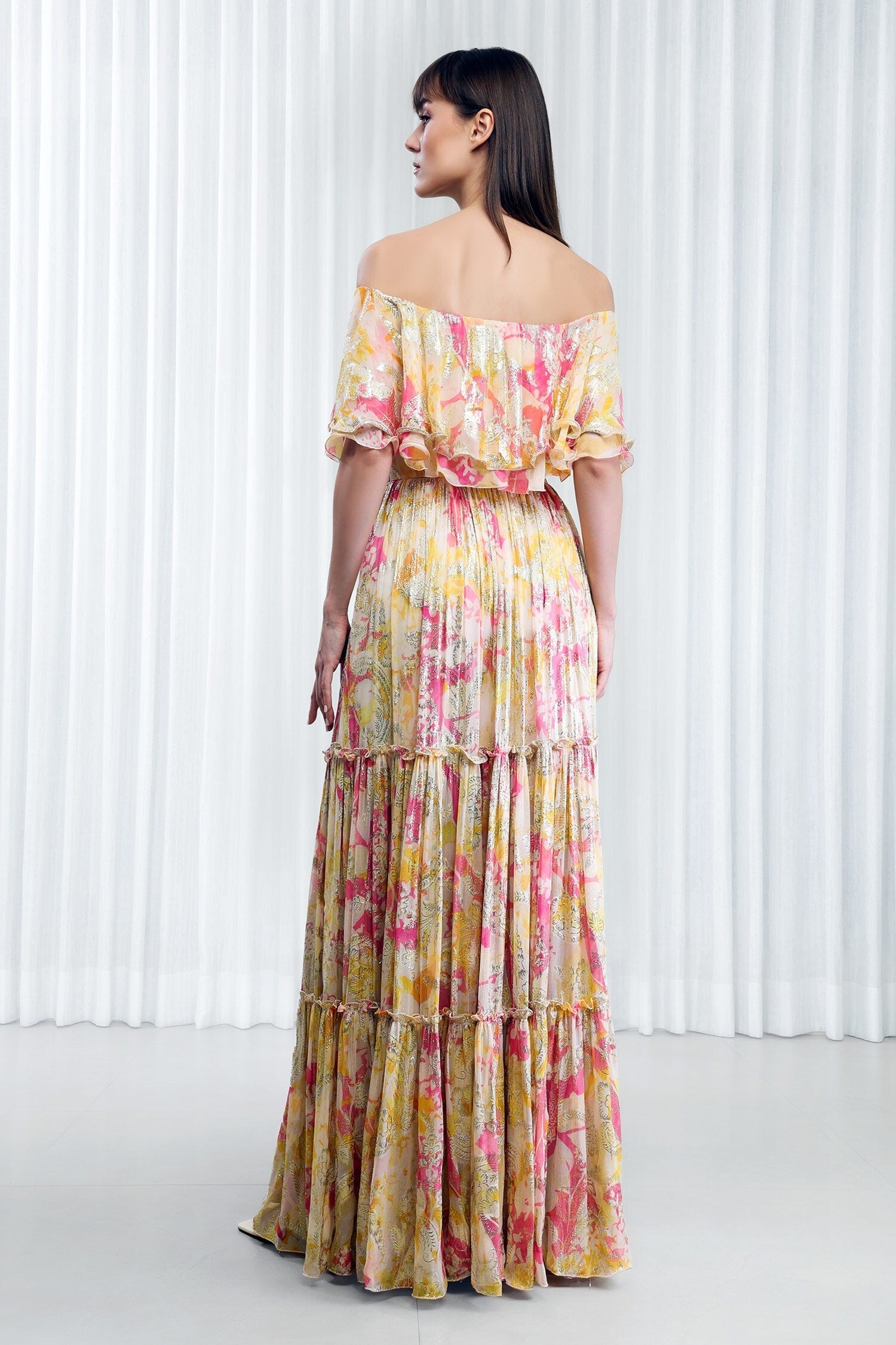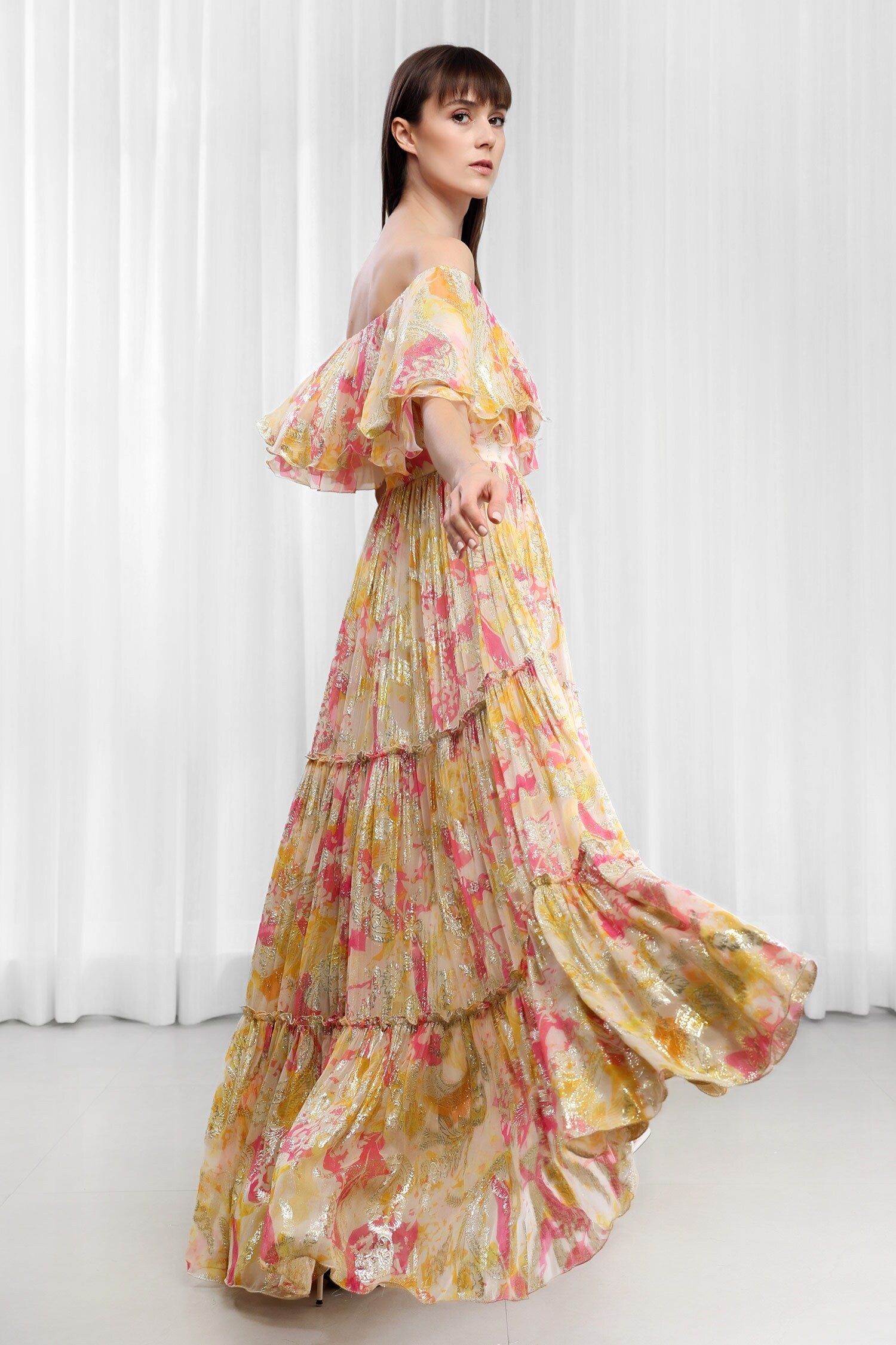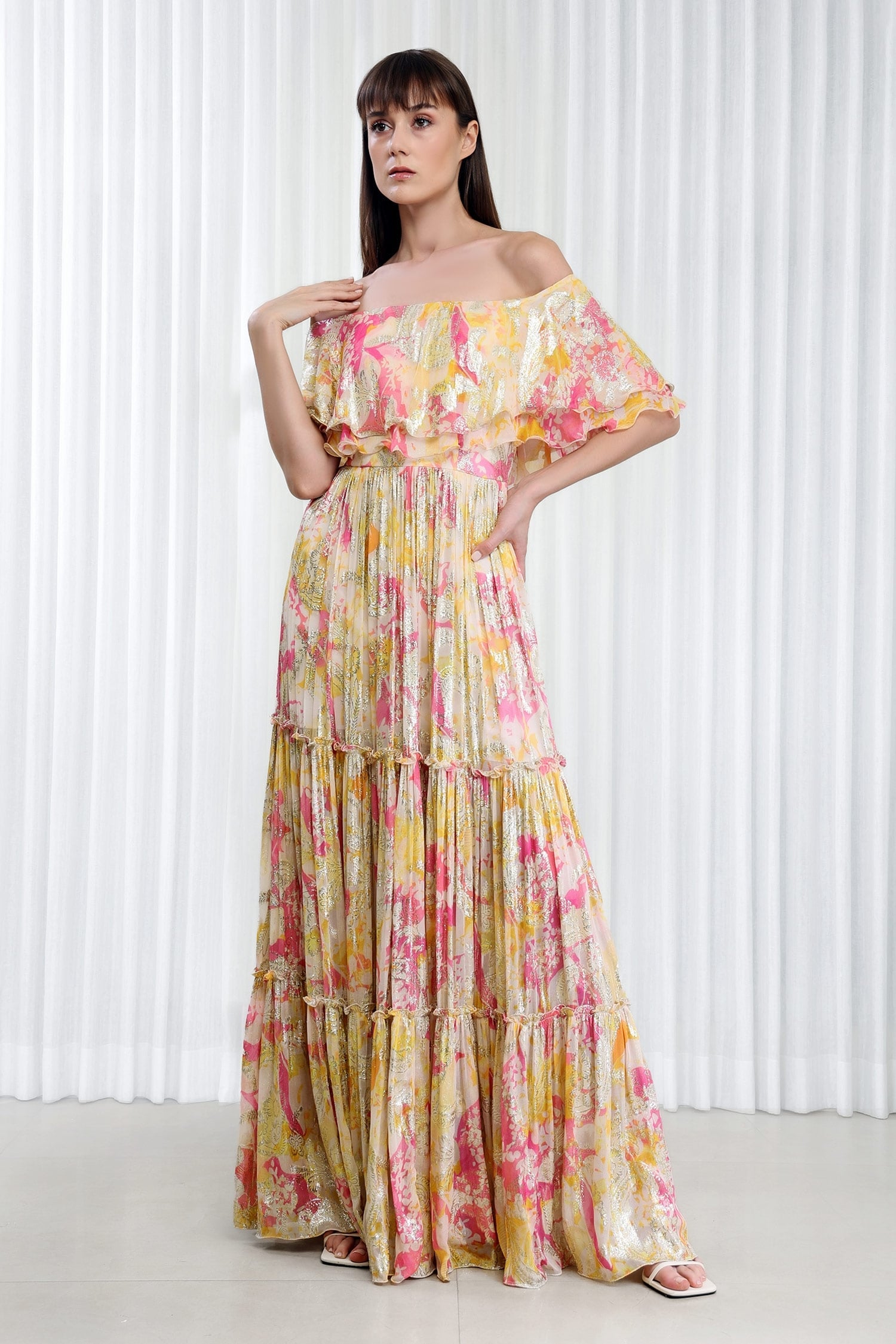 Multi yellow off-shoulder dress featuring daisy prints and tiered details.