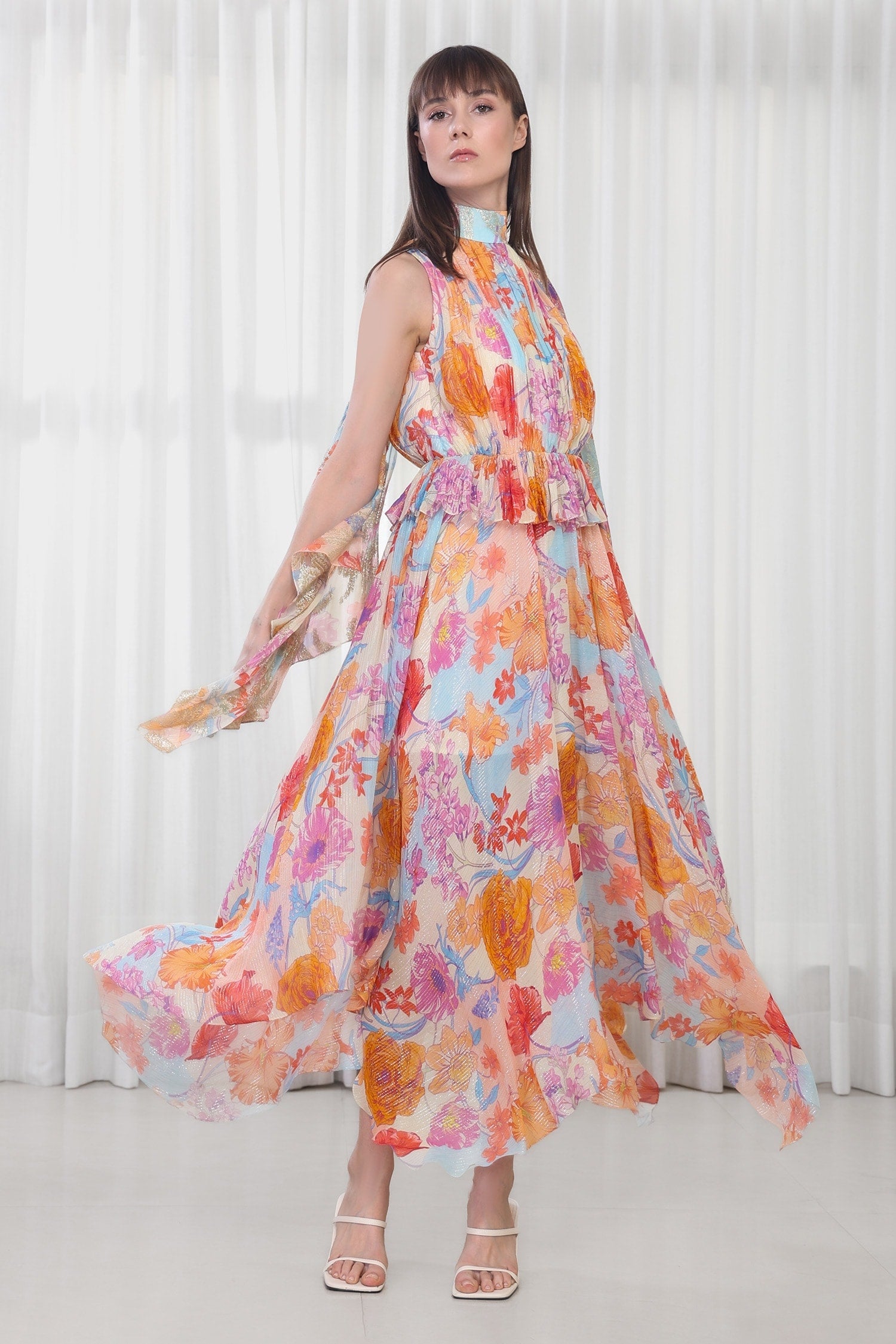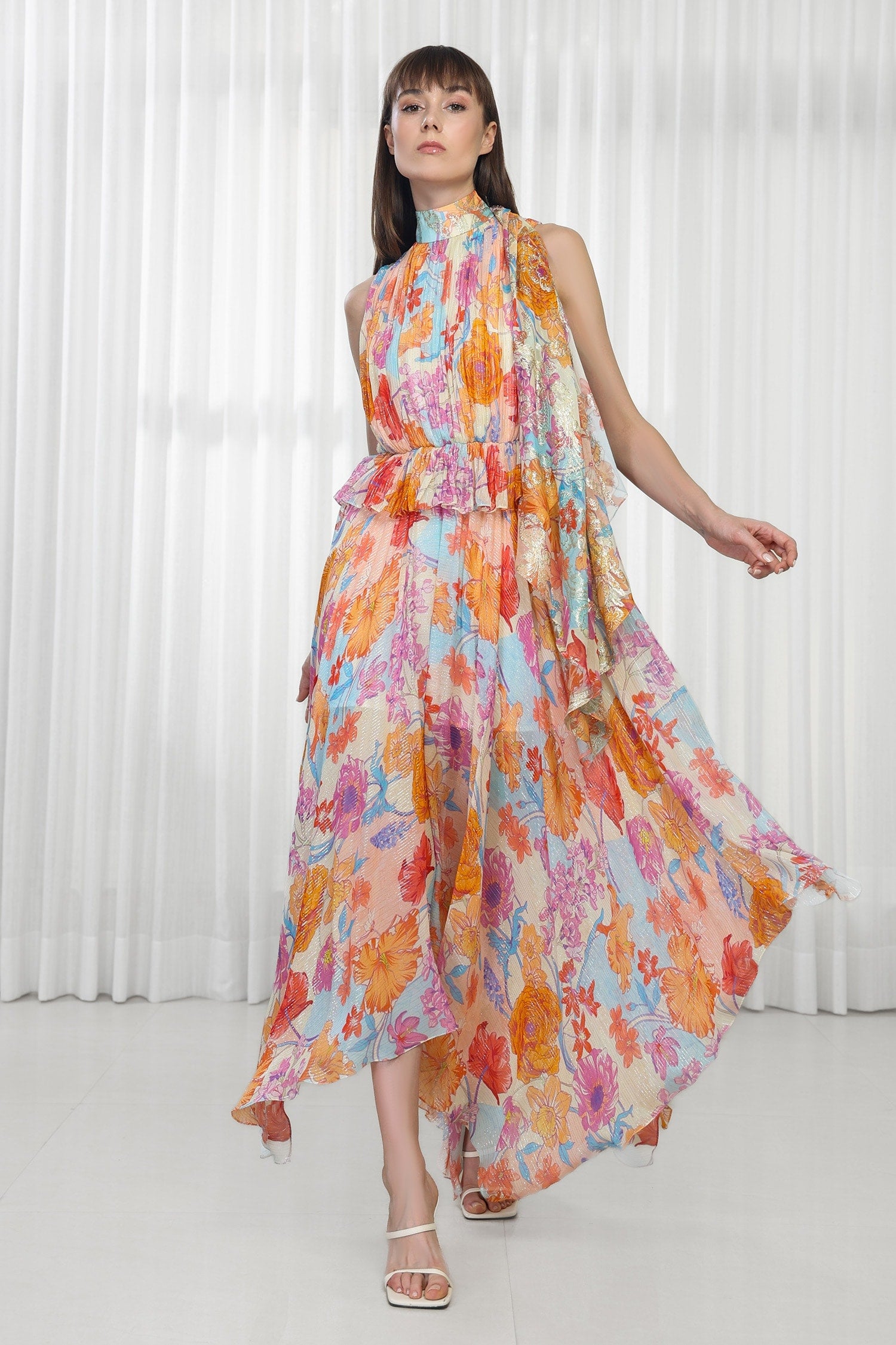 Multi orange layered maxi dress featuring hibiscus prints and a high neck tie-up.