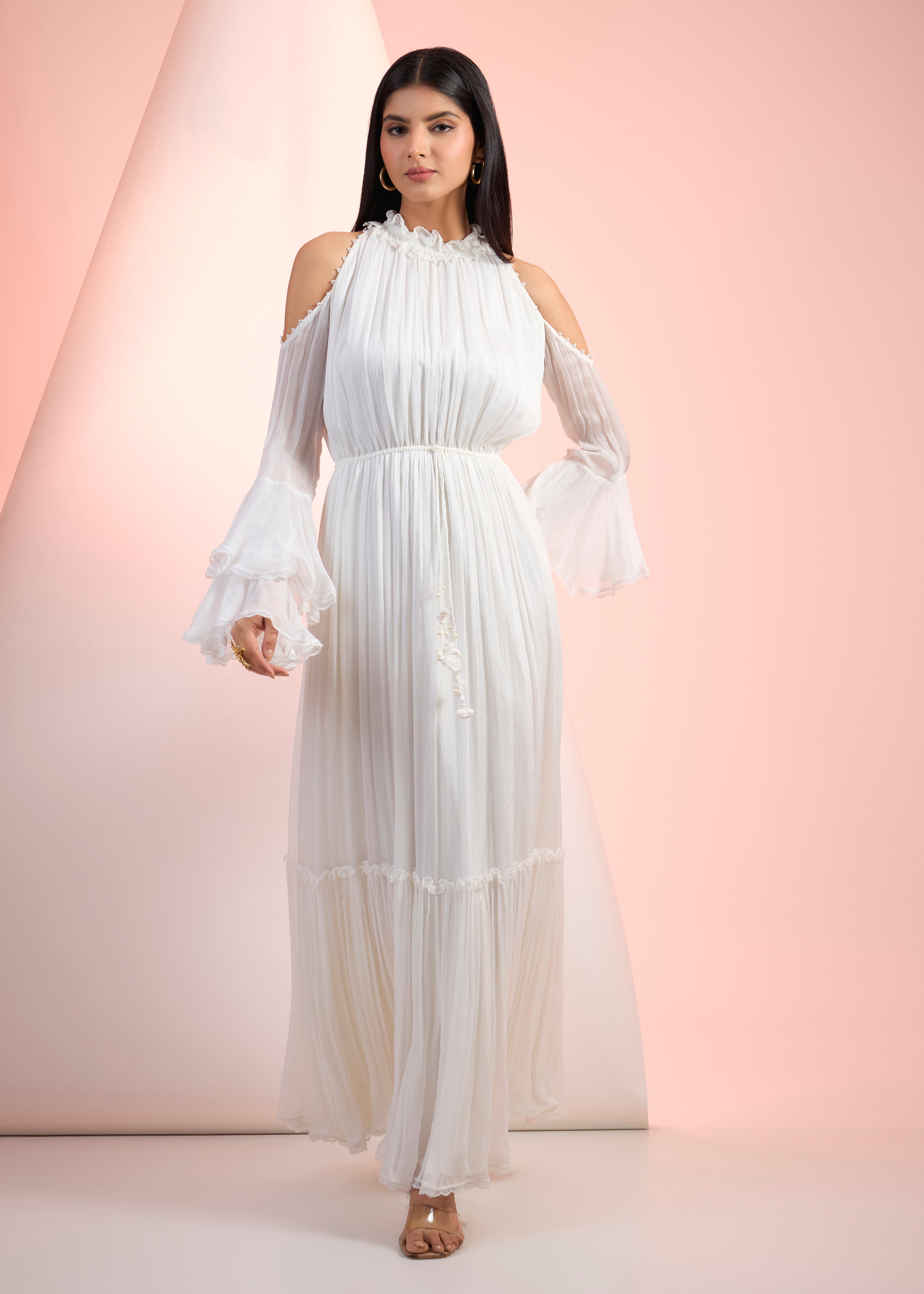 Off-White Solid Chiffon Dress is a graceful creation featuring delicate ruffles and an off-shoulder neckline. Crafted in lightweight chiffon, it offers a breezy silhouette that blends sophistication with modern charm, making it a versatile choice for both daytime and evening occasions.