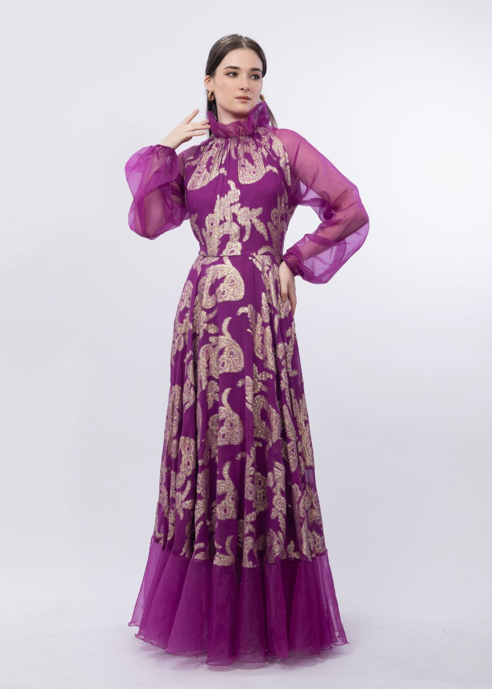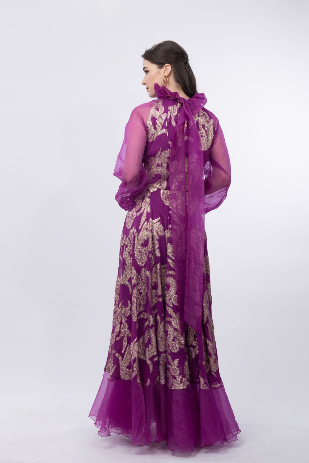Purple gold brasso raglan sheer sleeve long dress with ruffled neckline and layered organza bottom