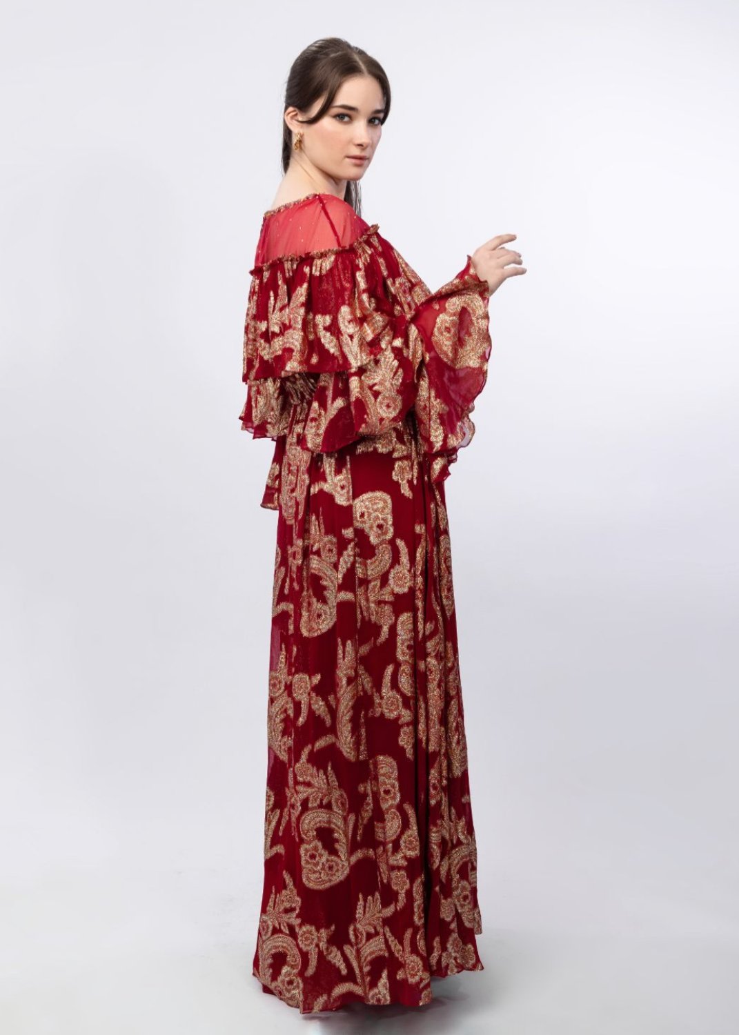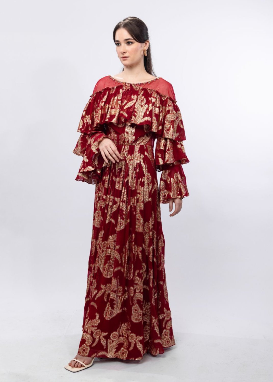 STYLING: Pair with statement earrings to amplify the allure of the Radiant Red Gold Brasso Ruffled Embroidered Organza Shoulder Dress, highlighting its unique side cut and layered sleeve.