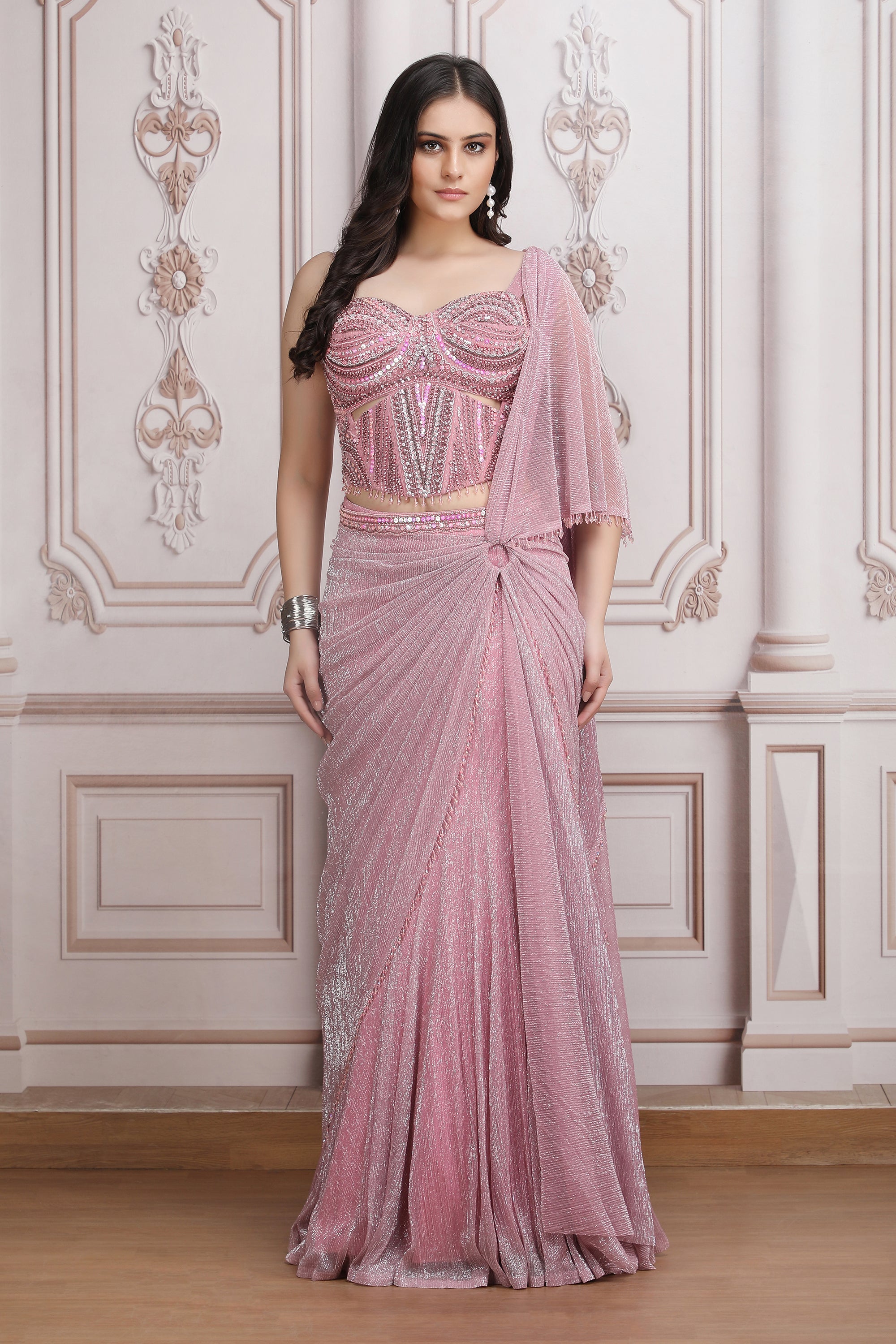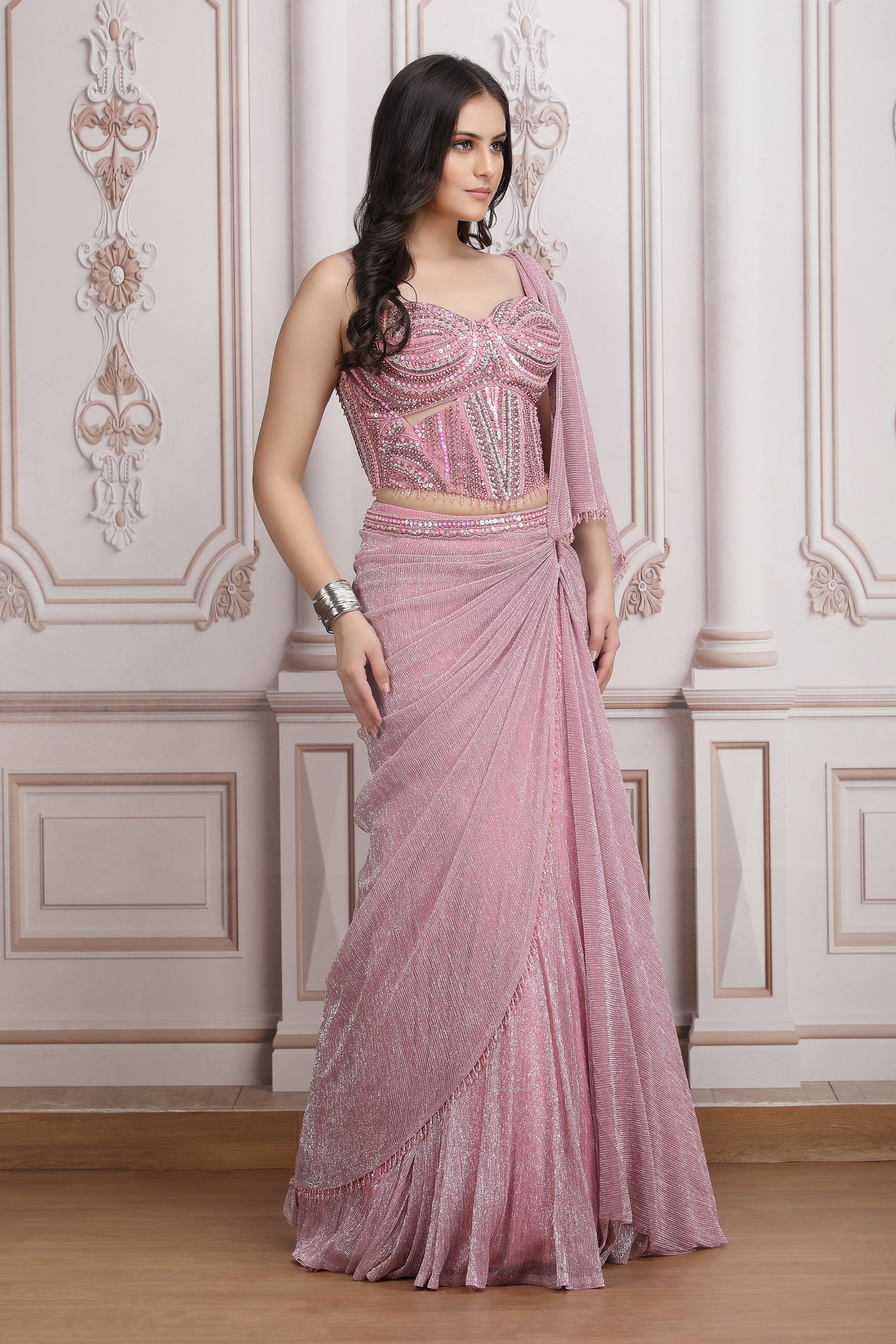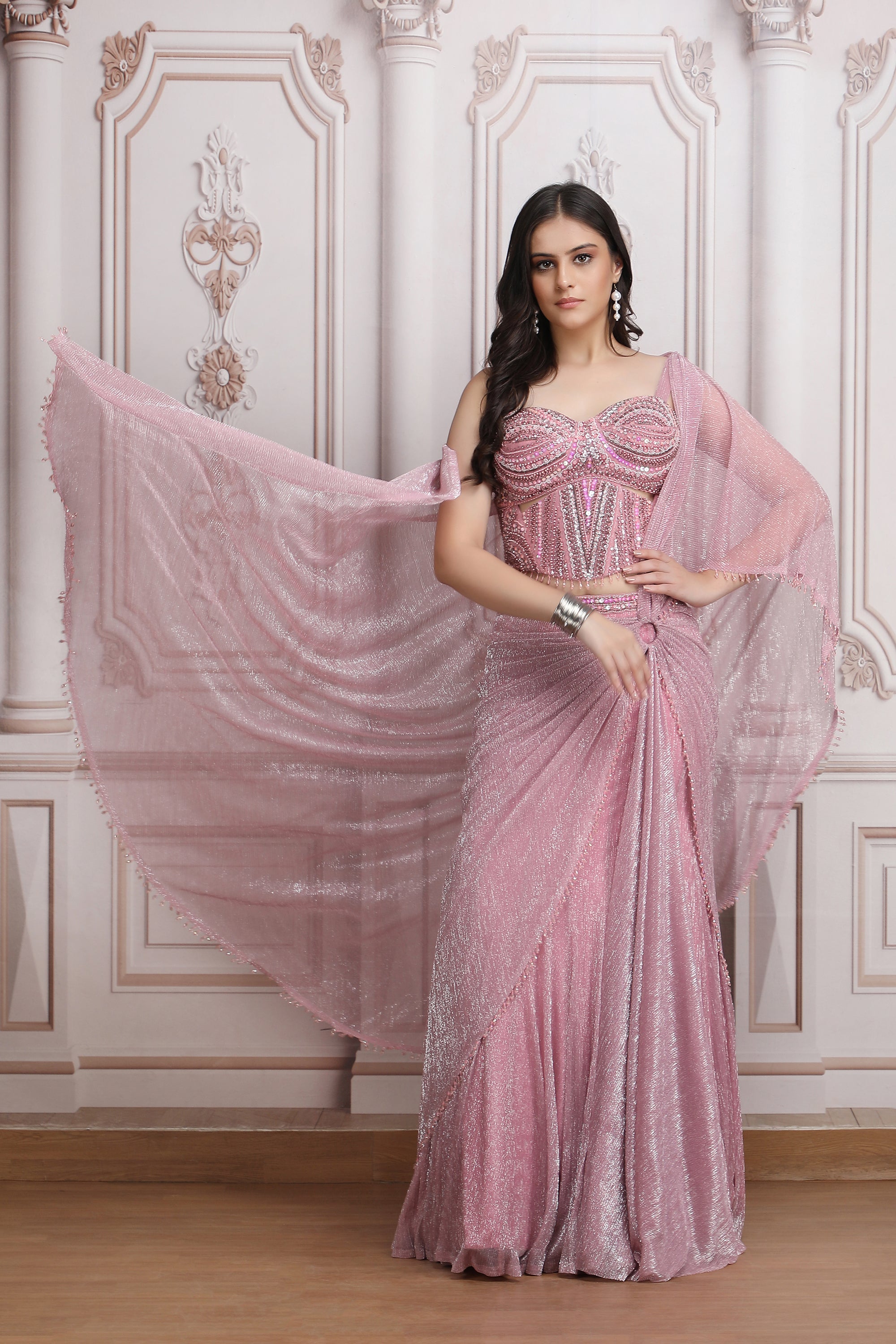 Radiate elegance in this rose mist shimmer lehenga set, featuring a structured embellished blouse and fluid drape detailing. The intricate sparkle and graceful silhouette make it a perfect pick for evening saree and wedding festivities.