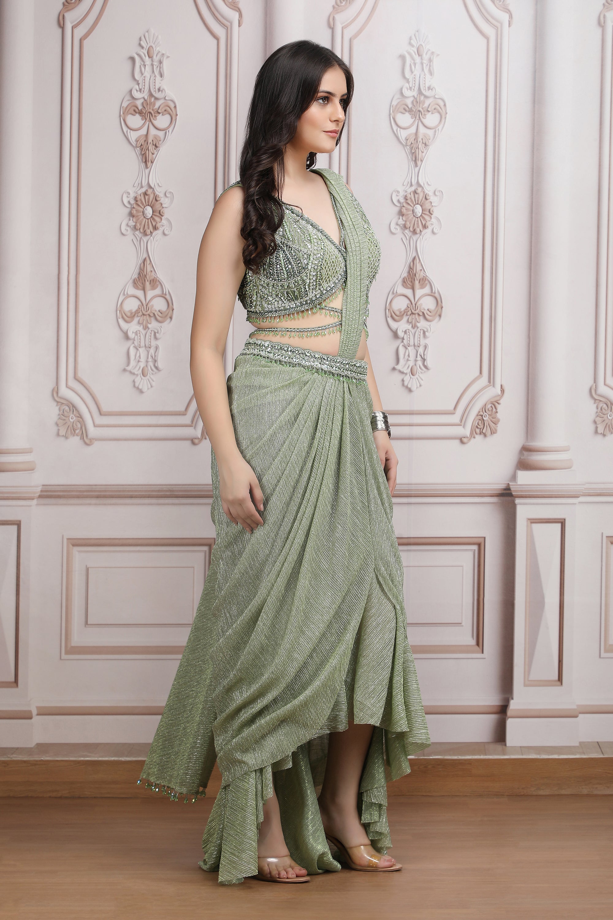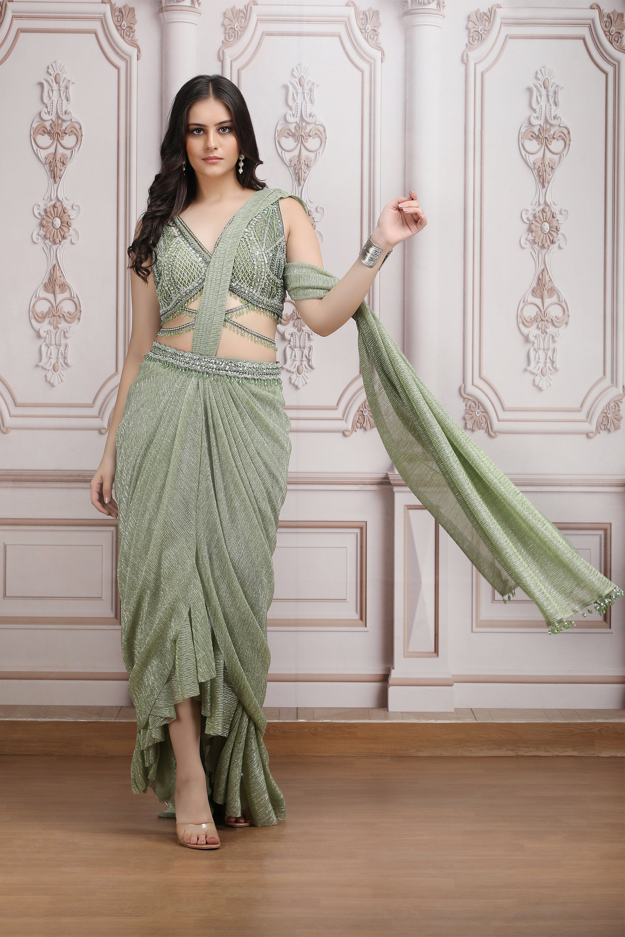 Sage Green Pre- Draped Saree With Embroidered Blouse