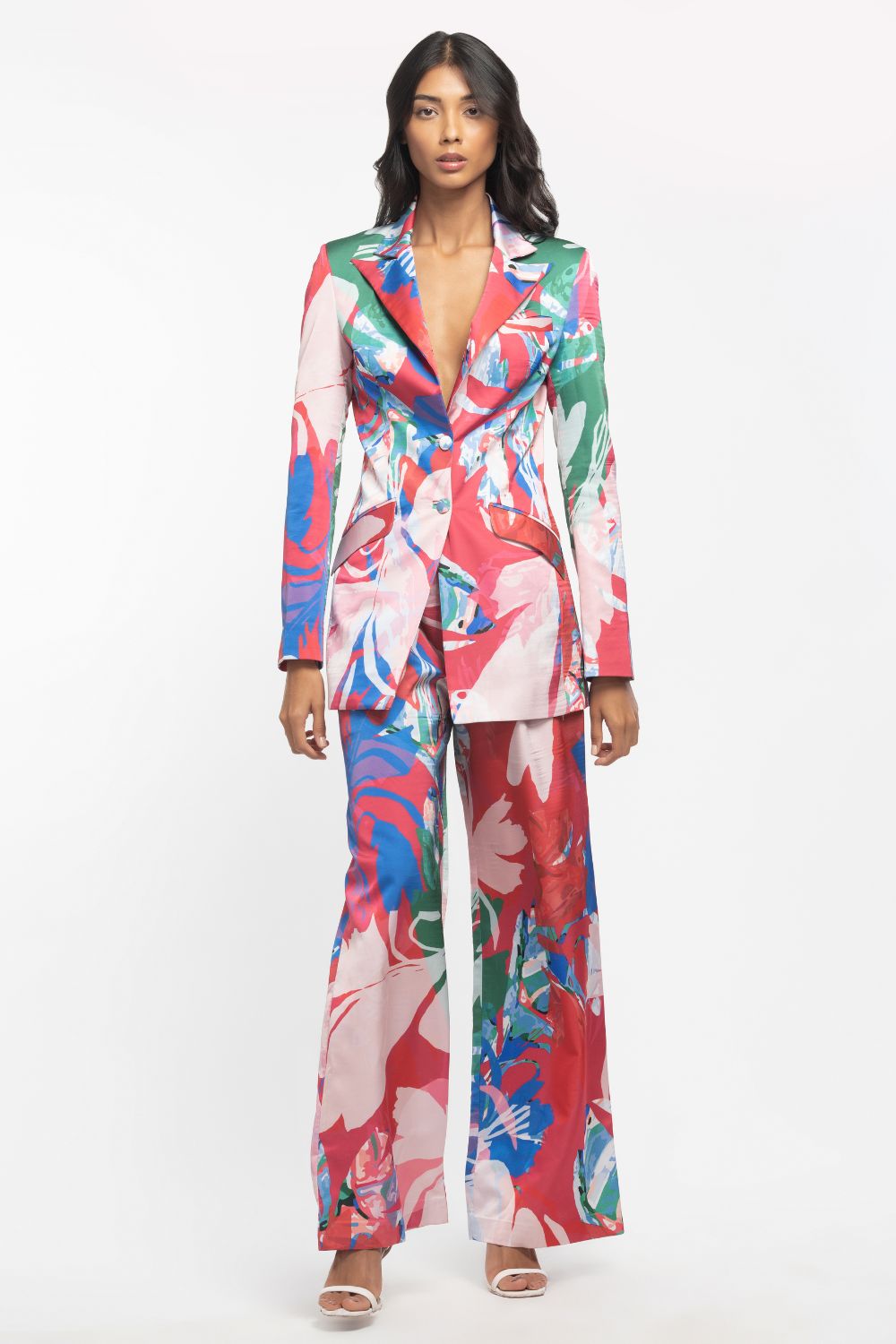 The Abstract Printed Satin Jacket offers a contemporary look with its unique design, while the matching Pleated Pants provide comfort and style. Designed to fit true to size, this ensemble is suitable for a wide range of occasions, from upscale events to stylish evenings out.