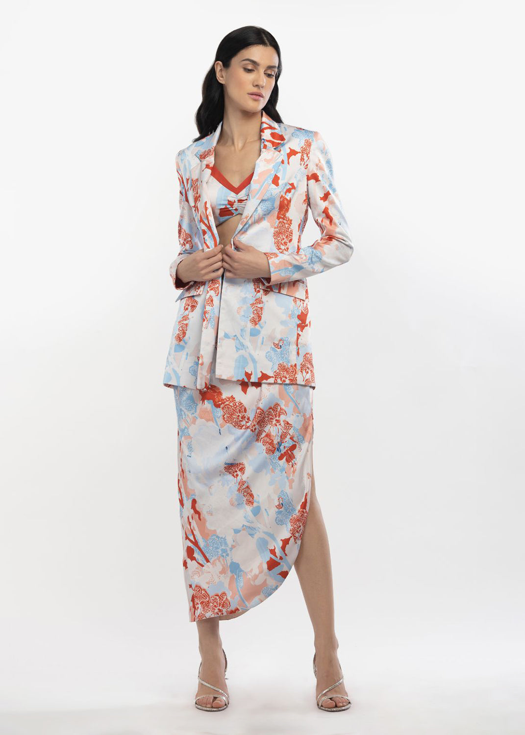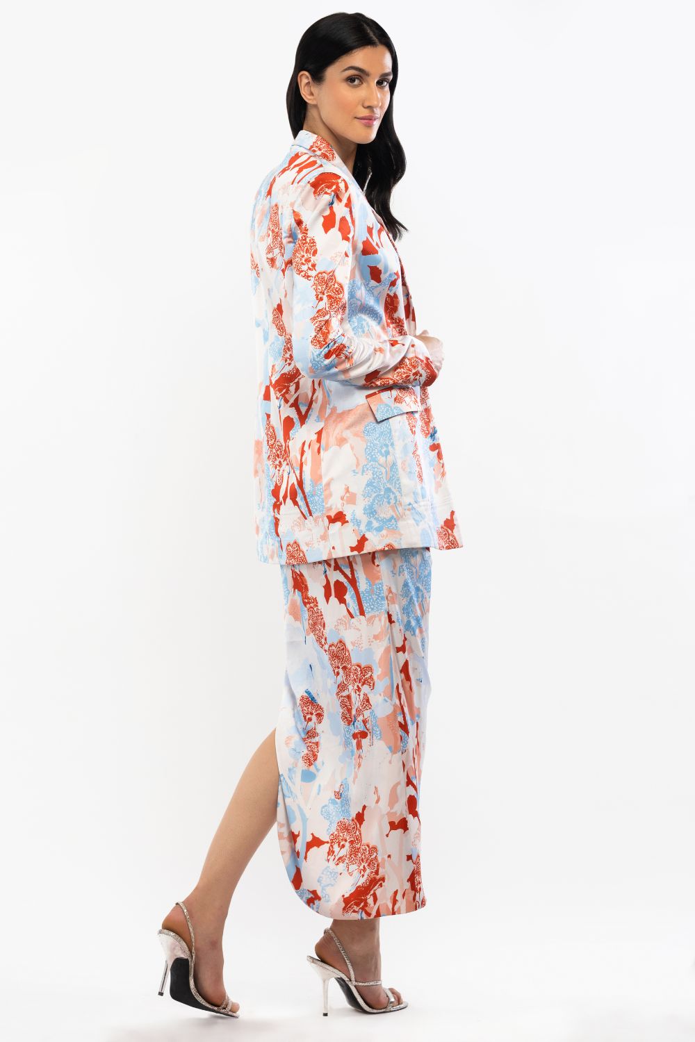 Styling: Elevate your ensemble game with this Satin Printed Jacket and Pant Set, a versatile choice that transitions seamlessly from daytime sophistication to evening chic, promising you a bold and confident look on any occasion.