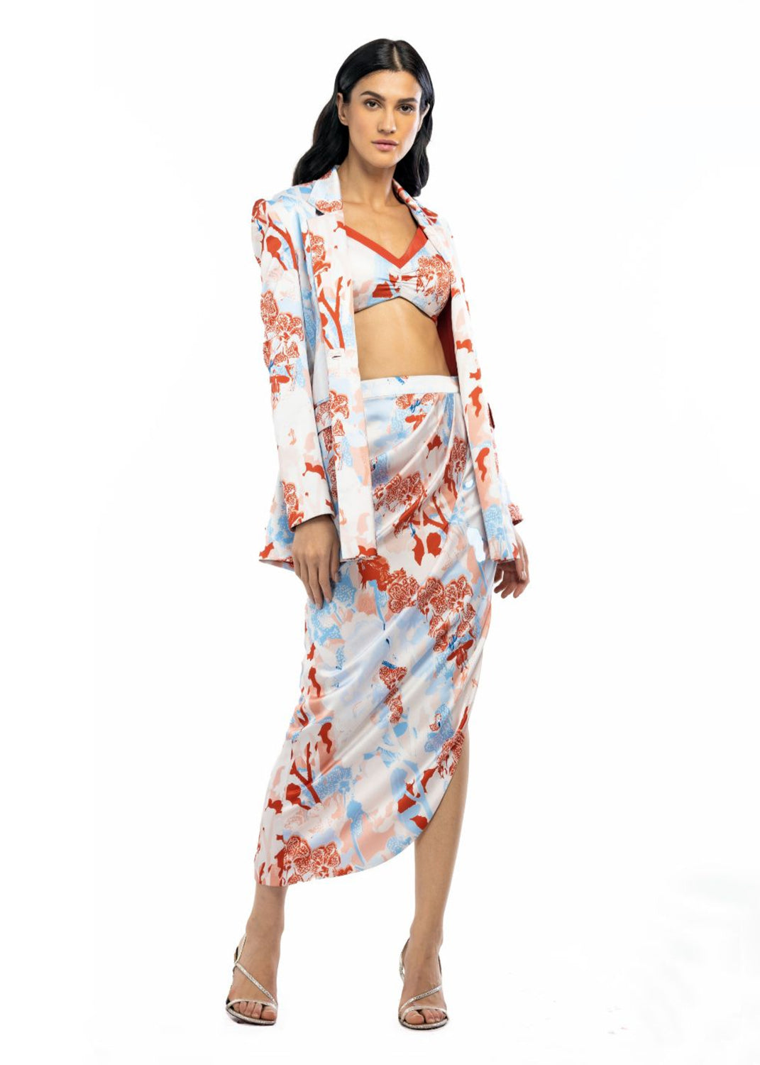 Satin Printed Jacket With Cowled Skirt And Bustier