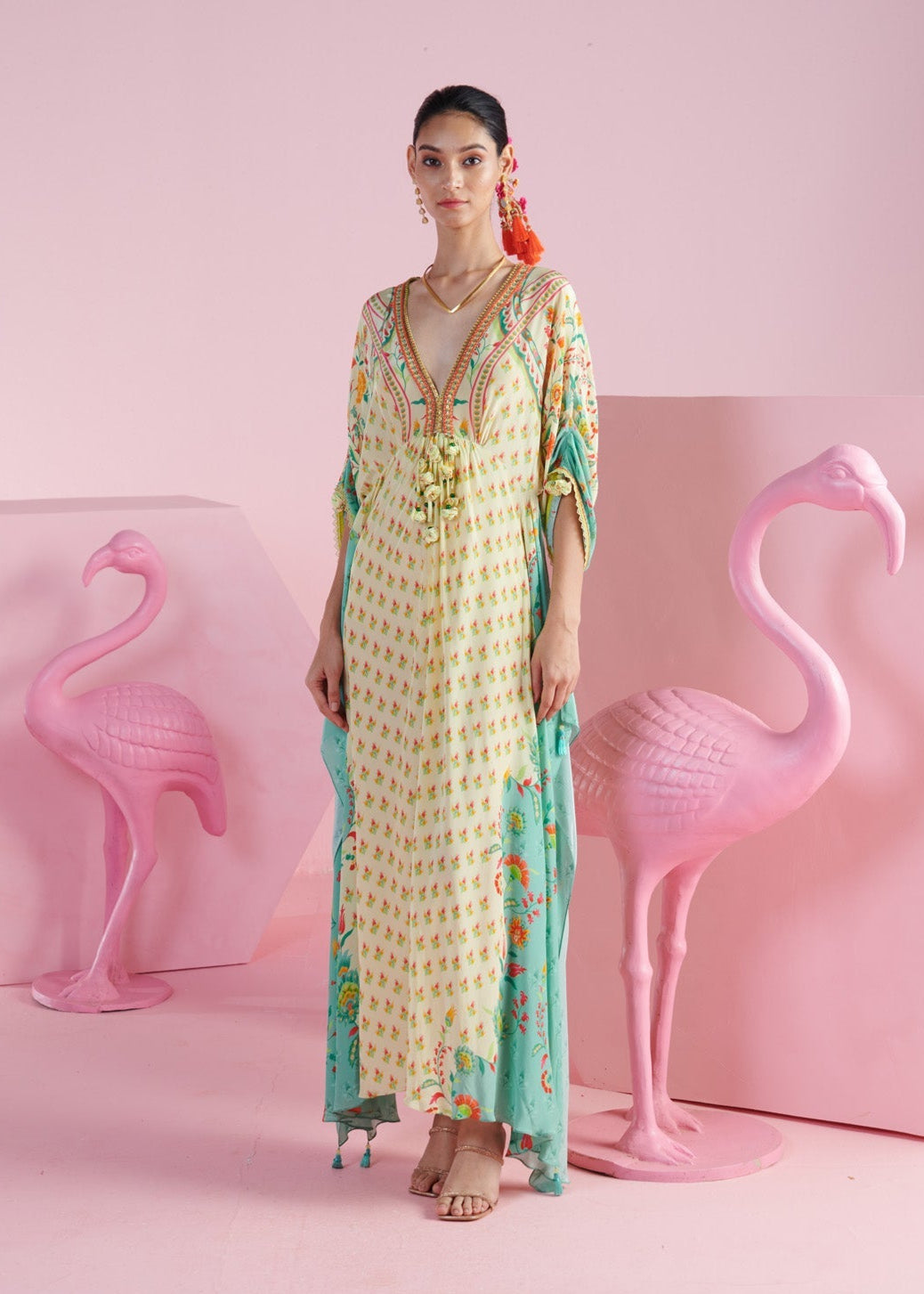 Experience a fusion of vibrant color and intricate design with the Deep V-Neck Lemon Iznik Print Kaftan. This stunning kaftan features a bold lemon hue adorned with detailed Iznik prints, offering a fresh and lively look. The deep V-neckline adds a touch of sophistication and allure with embroidery details, while the jade border provides a striking contrast that enhances the overall elegance of the garment. Perfect for making a statement at any event, this kaftan combines timeless beauty with contemporary style for a truly standout piece.