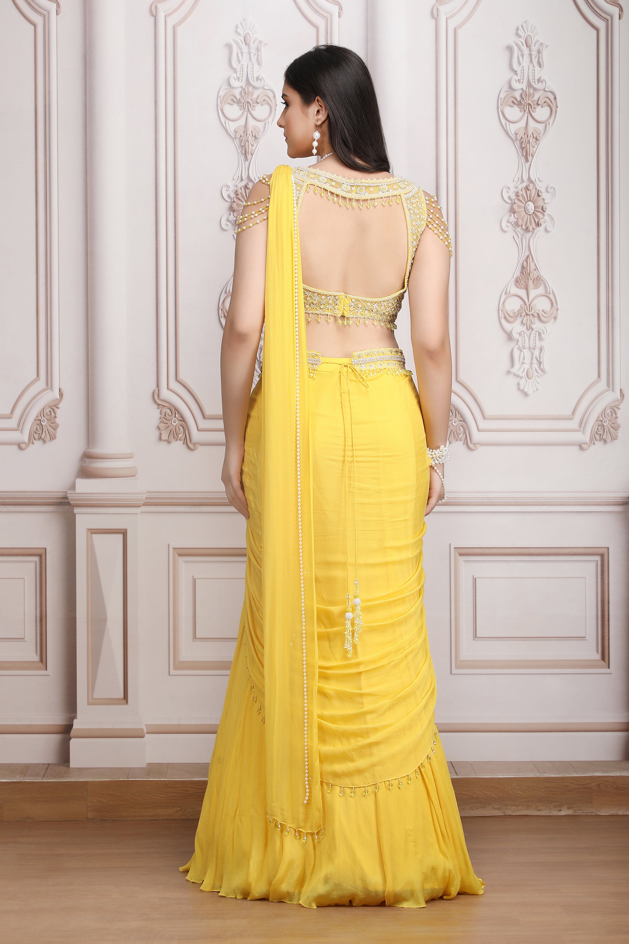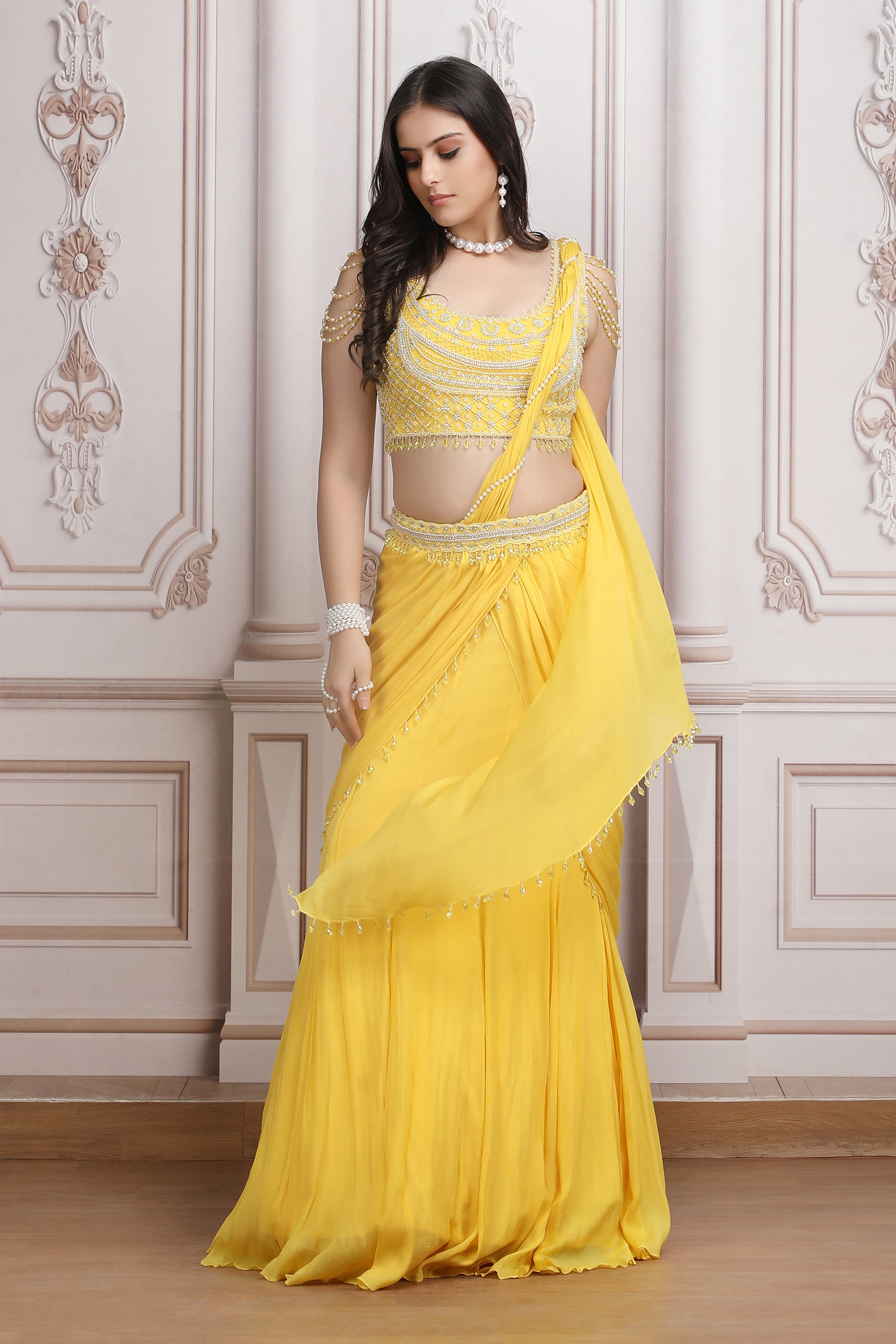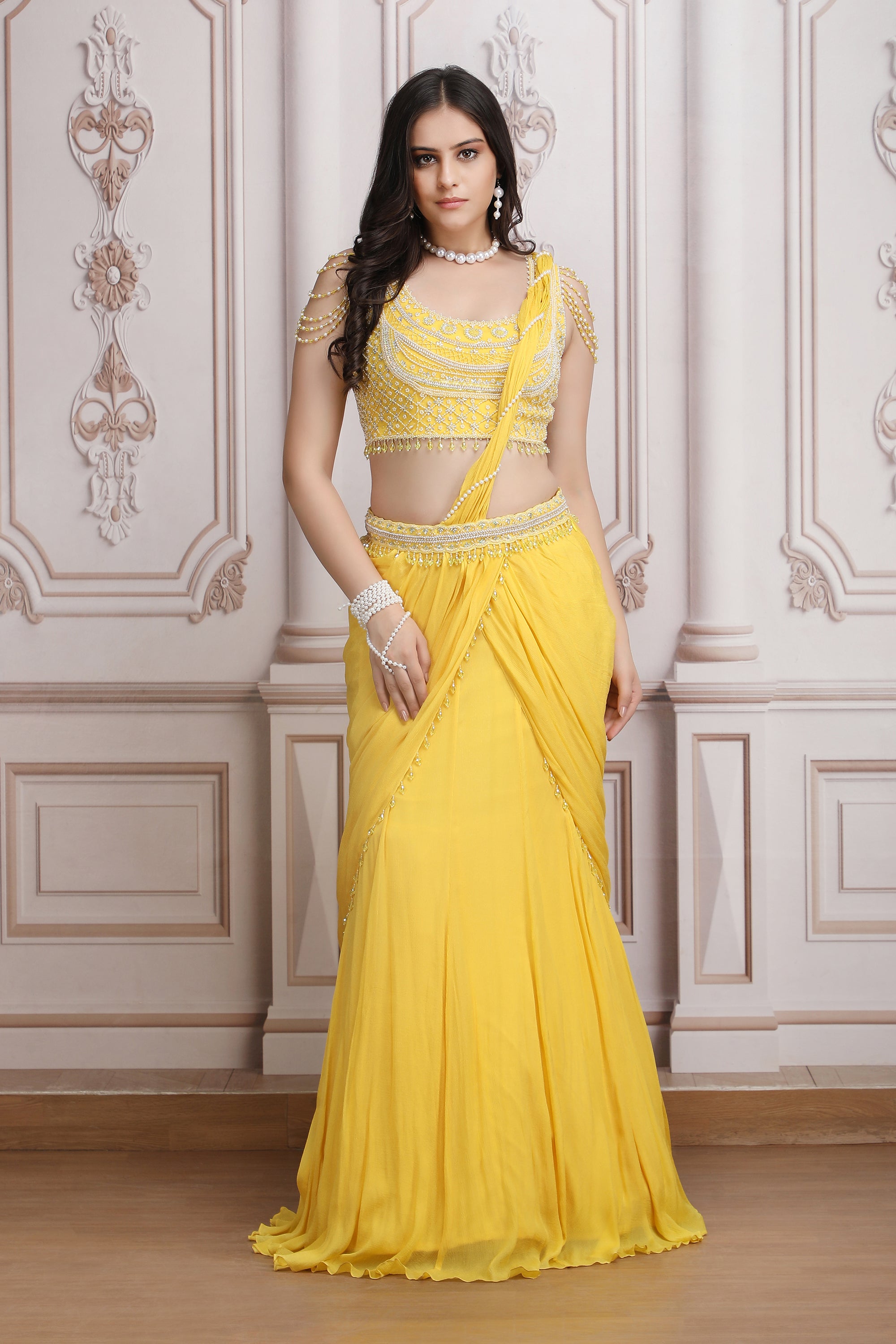 Yellow Drape Saree With Pearl Blouse